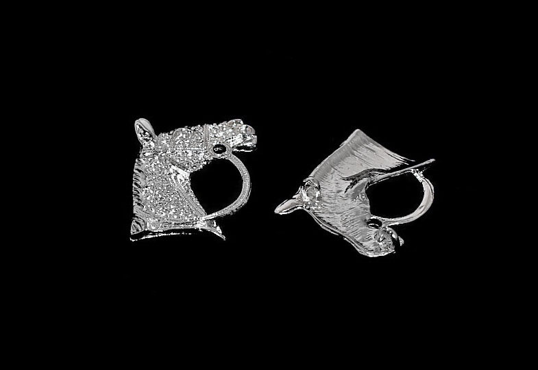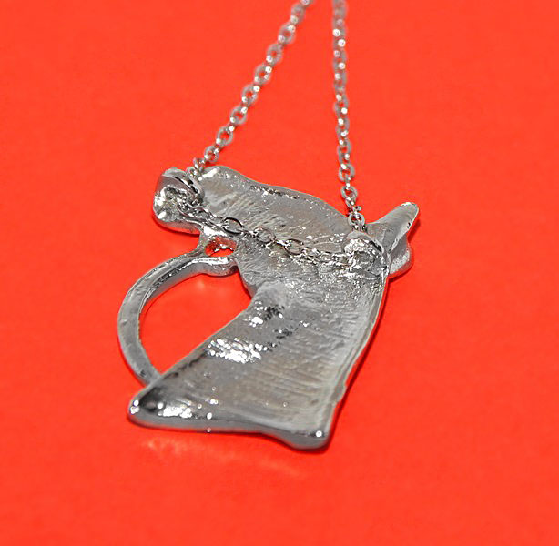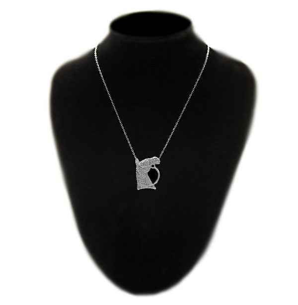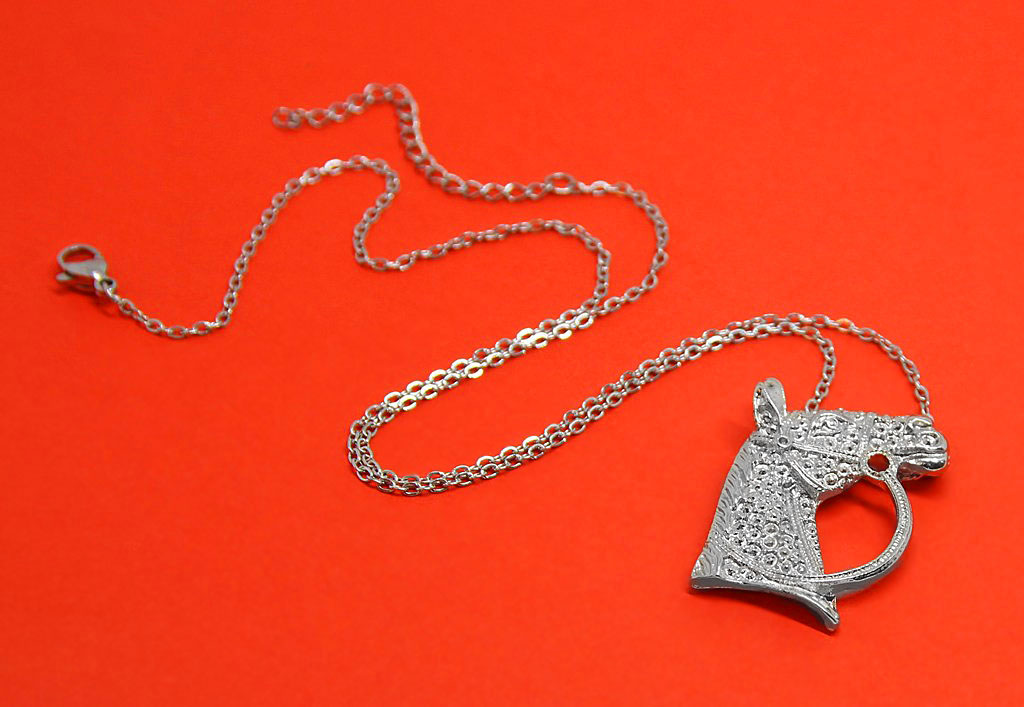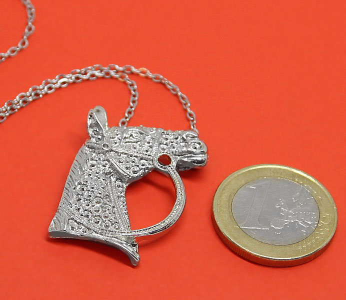 Reljeefse mustriga hobuse pea kujulise metallripatsi ja peenikese ketiga hõbedavärvi kaelaehe.