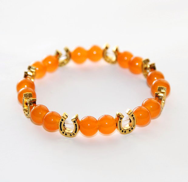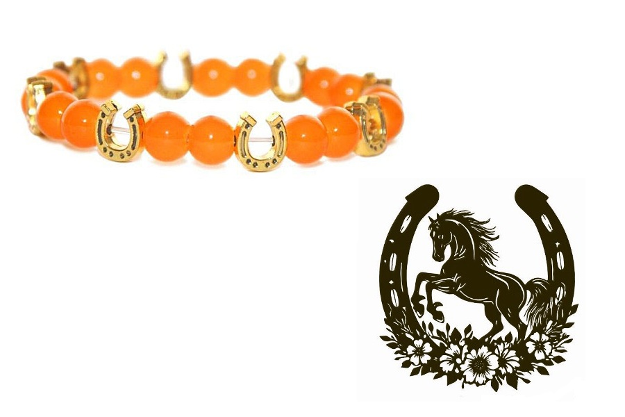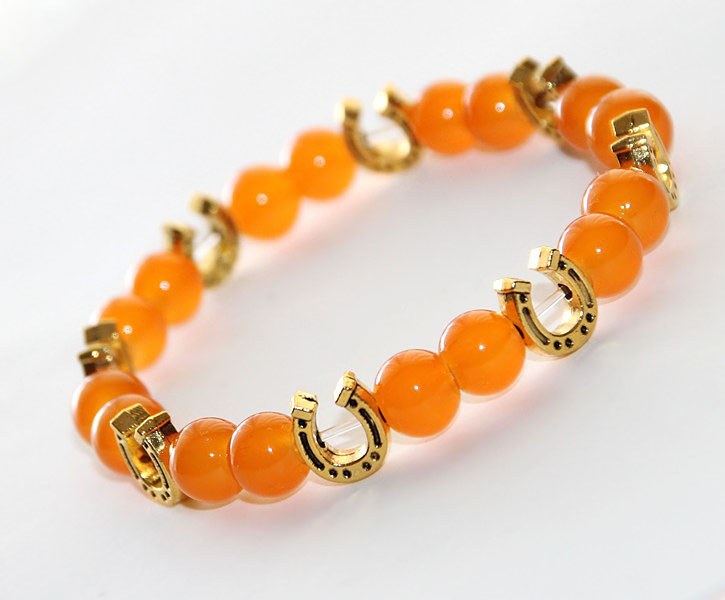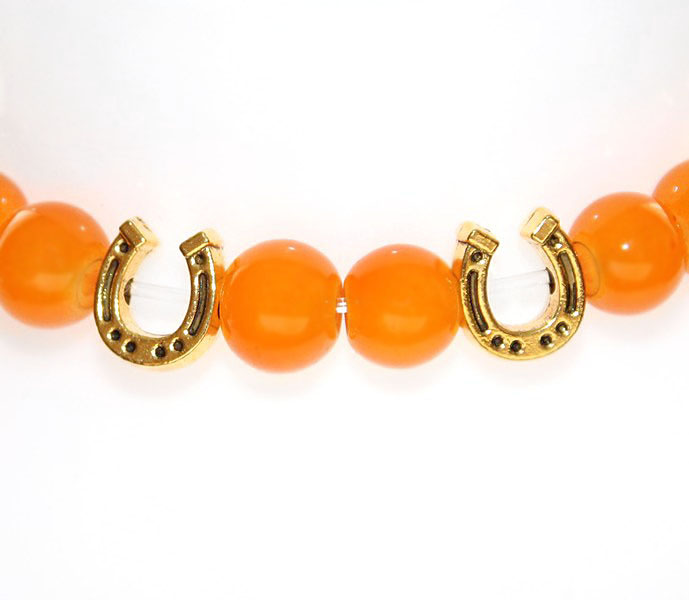 Efektseks apelsini värvi toonitud ahhaadi helmestega käevõru hobuserauakujuliste kullavärvi metallist kaunistusdetailidega.
