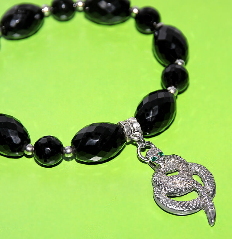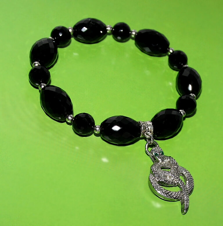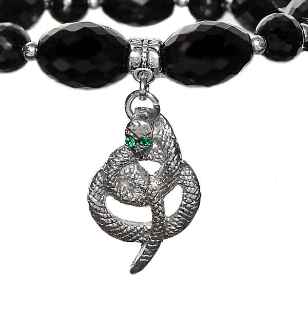 Tahuliste süsimustade ahhadi helmeste, tillukeste hõbedavärvi metallhelmeste ja efektse hõbedavärvi ussikujulise ripatsiga. Lihvitud ümmarguste poolvääriskivi helmeste diameeter on 10mm, ovaalsete helmeste suurus on 13mm x 18mm.