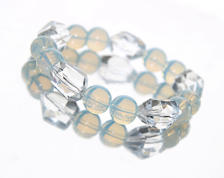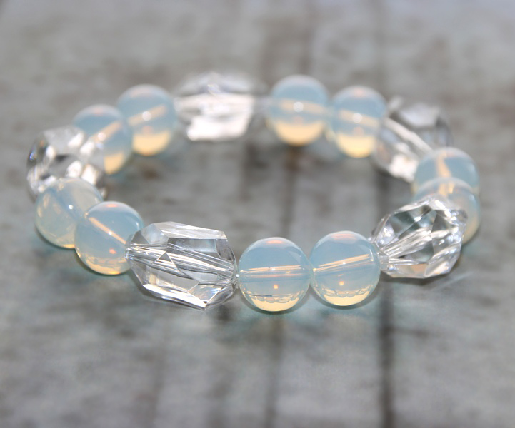 Kaunilt küütlevate opaliidi ümmarguste helmeste ja läbipaistvate tahuliste ja kergete akrüülhelmestega käevõru.