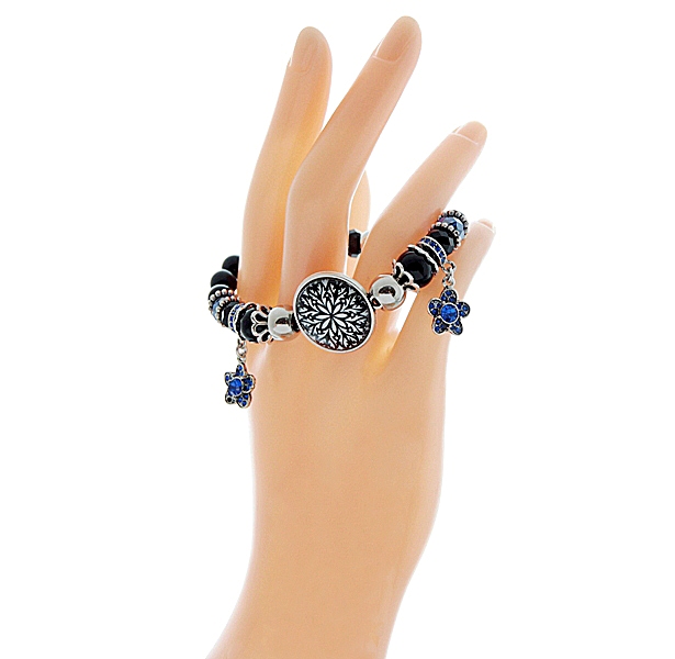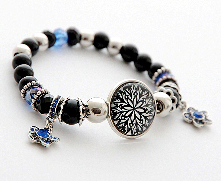 Säravate siniste ja mustade klaashelmeste, hõbedavärvi metallhelmeste, siniste lillekujuliste ripatsite ja rahvuslikel ainetel mustrilise kameega käevõru. Helmeste suurus on 8mm, mustakirju rahvusmustrilise klaaskamee suurus on 2 cm. Siniste klaaskristallidega kaunistatud lill-ripatsi suurus on 12mm. Käevõru on elastikkummiga ning seda on mugav käele rullida (NB! Kummi mitte venitada!). Sobib randmeümbermõõdule kuni 17,5 cm