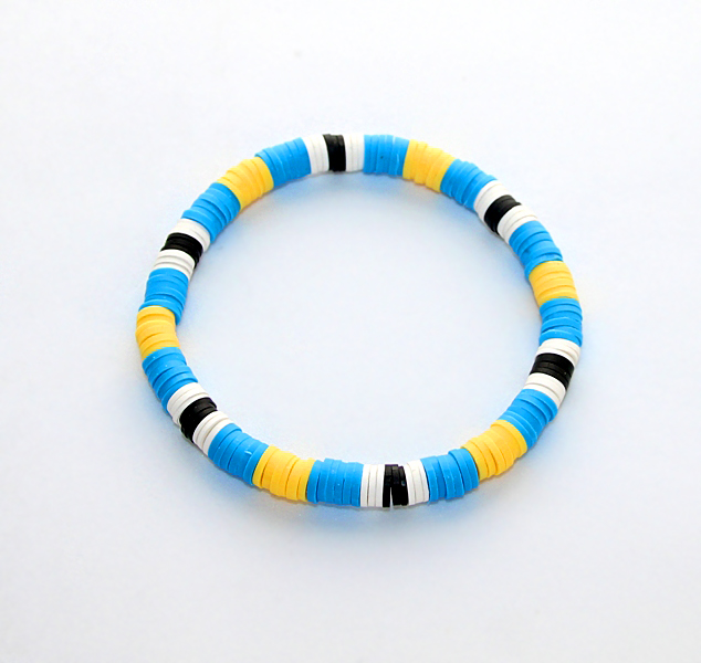 Väikeste kollaste, siniste, valgete ja mustade silikoonist seibidega käevõru. Seibi diameeter on 6mm, laius 1mm. Käevõru on elastikkummiga ning mugavalt käele rullitav.
