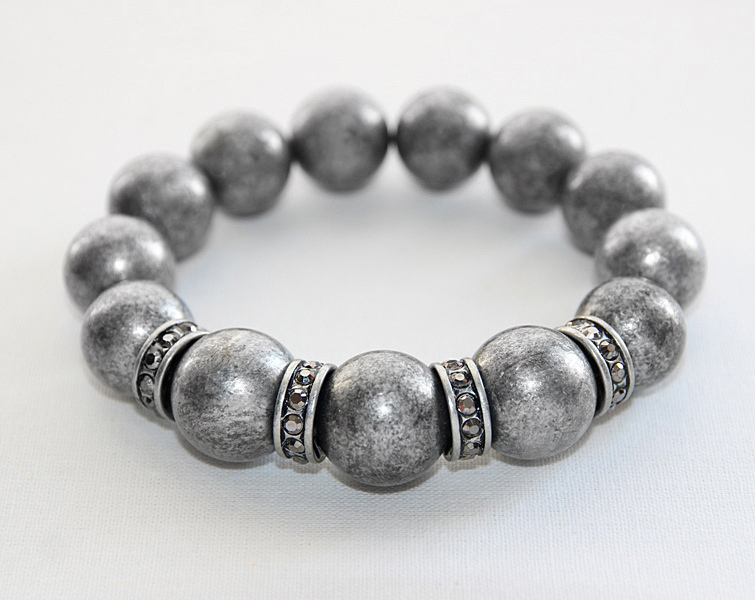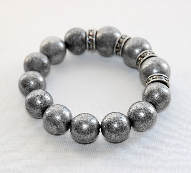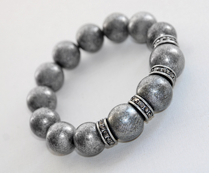 Kahes suuruses vanahõbedavärvi metallhelmeste ja hematiidivärvi sädelevate klaaskristallidega kaunistatud vahehelmestega vintage stiilis käevõru. Metallhelmeste suurused on 14mm ja 16mm.