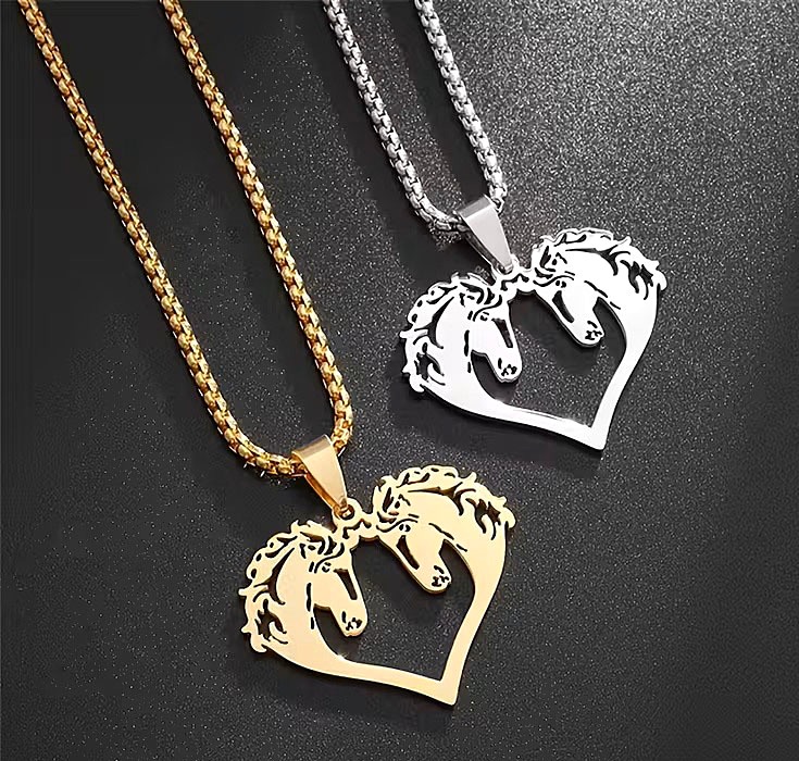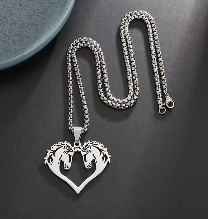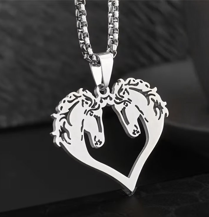Kahest hobuse peast kaunilt südamekujuliseks kaarduva metallripatsiga hõbedavärvi kaelakett.