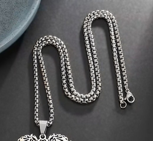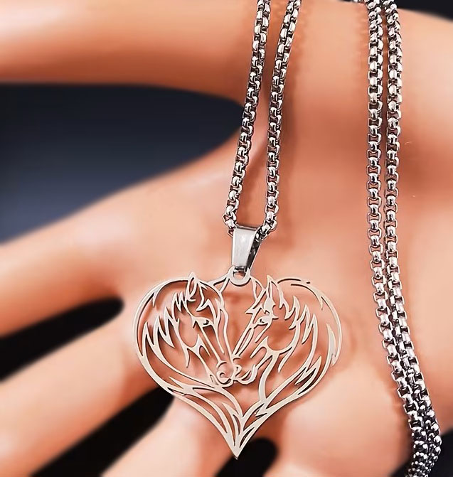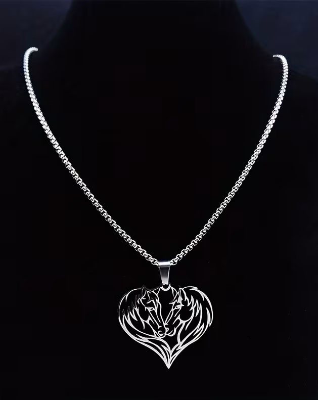 Kahest hobuse peast kaunilt südamekujuliseks kaarduva “õhulise ja pitsilise” metallripatsiga hõbedavärvi kaelakett.