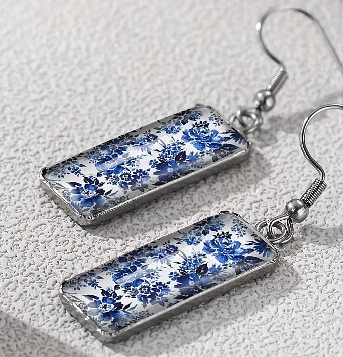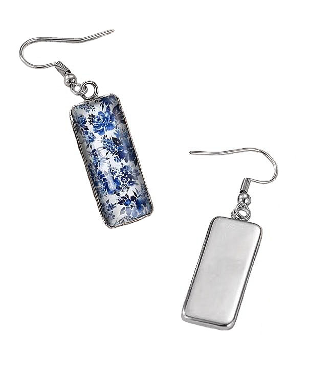 Sini-valgetes värvides lillemustrilised rahvuslikel ainetel hõbedavärvi kõrvarõngad.