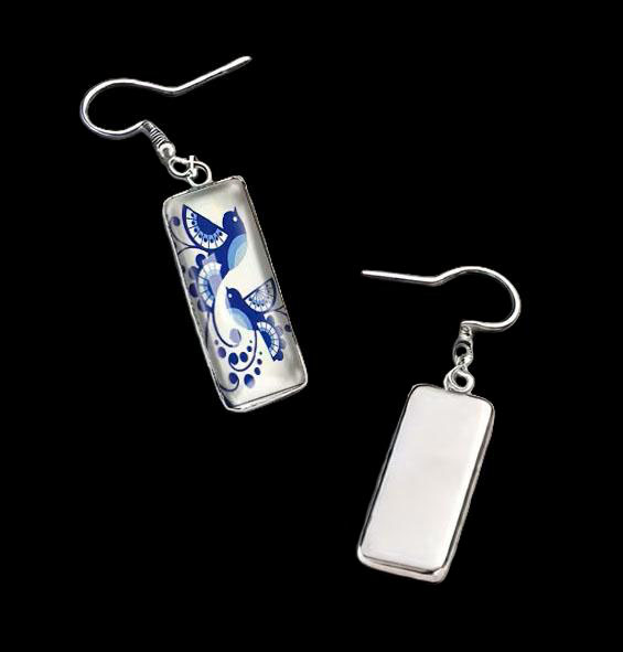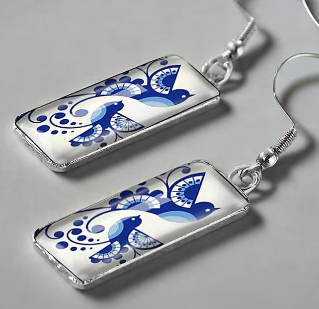 Sini-valgetes värvides stiliseeritud pääsukestega rahvuslikel ainetel hõbedavärvi kõrvarõngad.