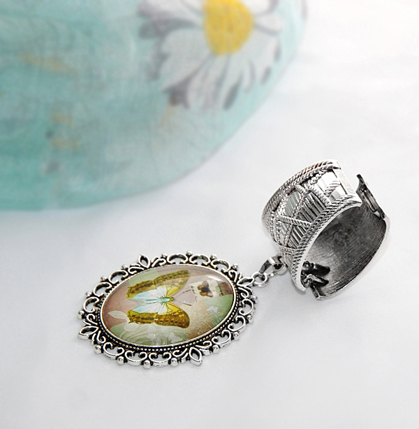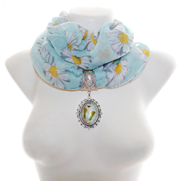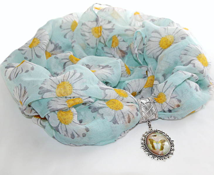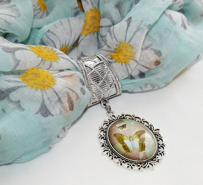 Pastelltoonides liblikamotiividega klaaskamee suurus on 3 cm x 4 cm, ripatsi suurus koos pitsilise metallraamiga on 4 cm x 5 cm. Salli laius on 55 cm, pikkus 180 cm (kokkuõmmelduna moodustuva täisringi mõõt).