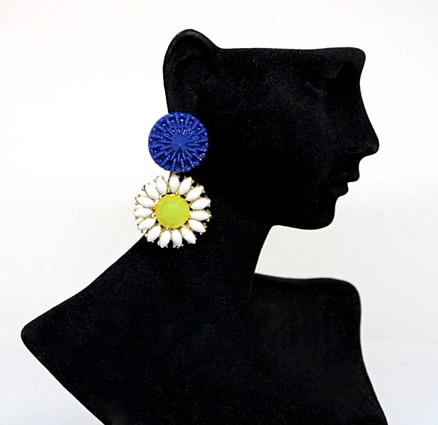Rukkilille meenutava suure sinise akrüülist kinnitusdetaili ning karikakramotiiviga kullavärvi poltkõrvarõngad.