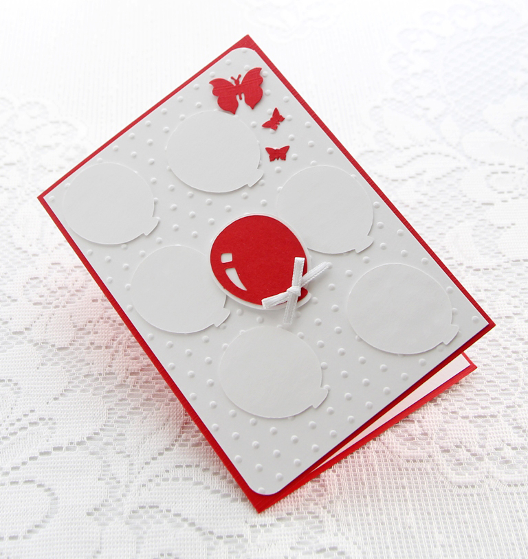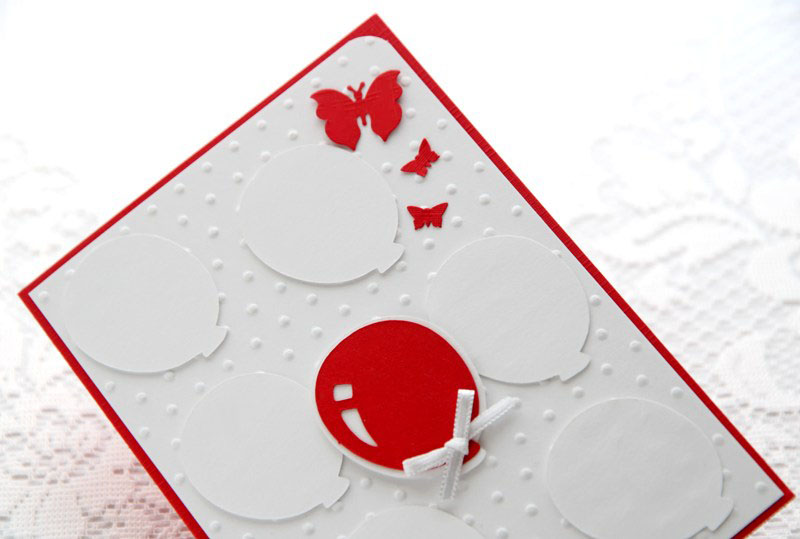 Kahepoolne punasest kartongist käsitöökaart sissepressitud täppidega valge pealse, reljeefsete õhupallikujuliste kaunistusdetailide ja väikeste punaste liblikatega. Kaardi keskel olev punane õhupall on kaunistatud väikese valge atlasspaelast lipsukesega.