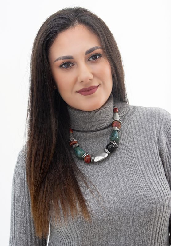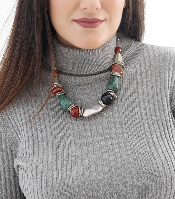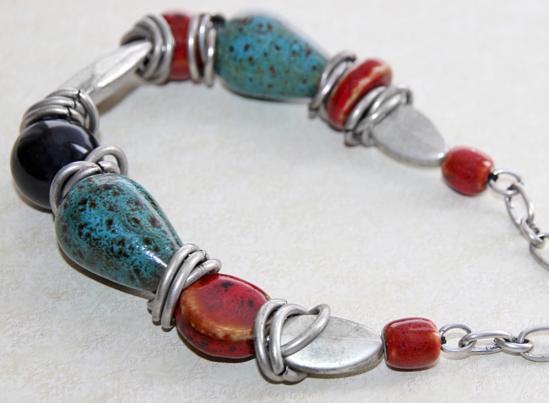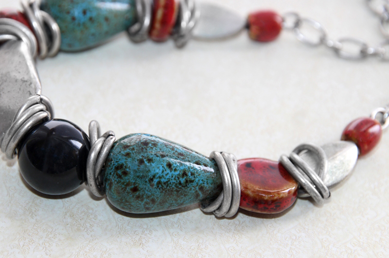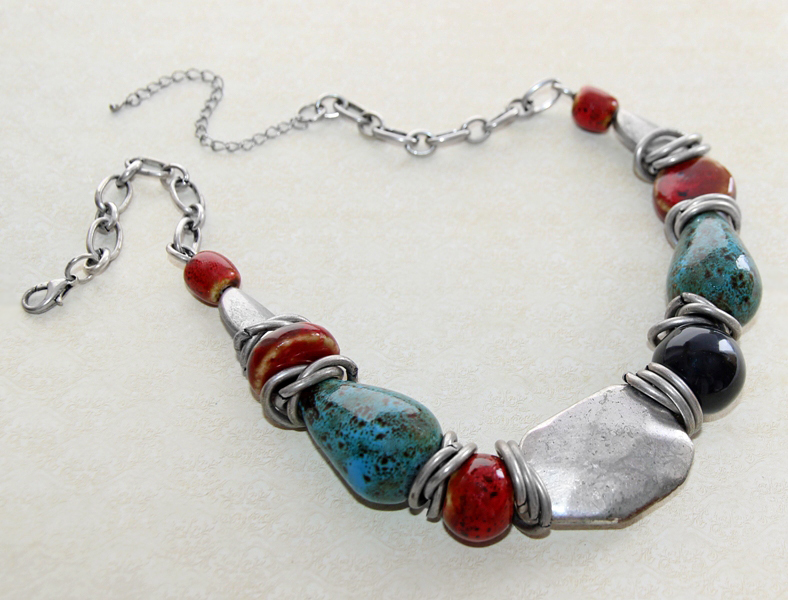 Vanahõbedavärvi metallhelmeste ning musta, punase ja türkiisivärvi emailkattega keraamiliste (savist) helmestega etno stiilis kaelakee. Kaelakee pikkus on reguleeritav suuremat sorti tugeva vanahõbedavärvi keti ja igasse ketilülisse kinnitatava karabiinhaagiga kuni 54 cm-ni. Helmestega osa pikkus on 27 cm.