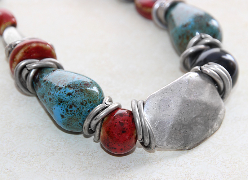 NB! Kaelakee on üsna suur ja “kaalukas”! Tilgakujuliste keraamiliste helmeste suurus on 2 cm x 3,7 cm. Keskmise kandilise vanahõbedase metalldetaili suurus on 3 cm x 4 cm.