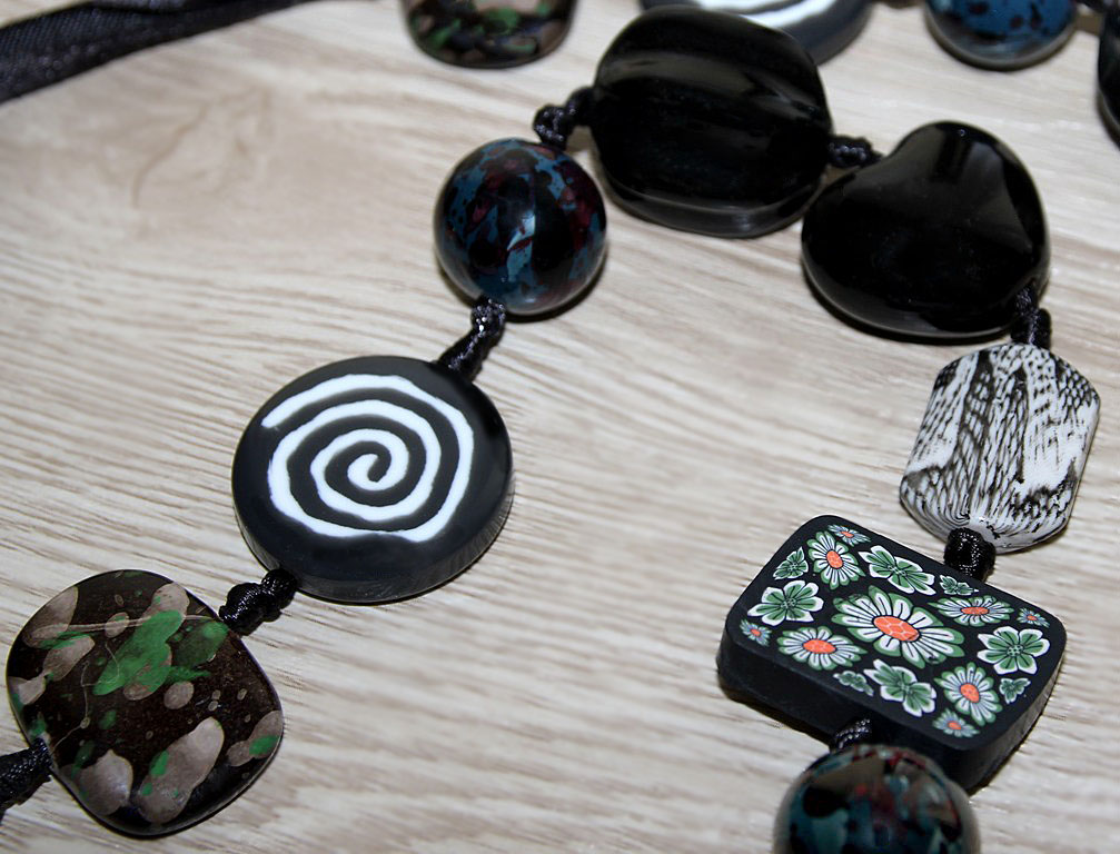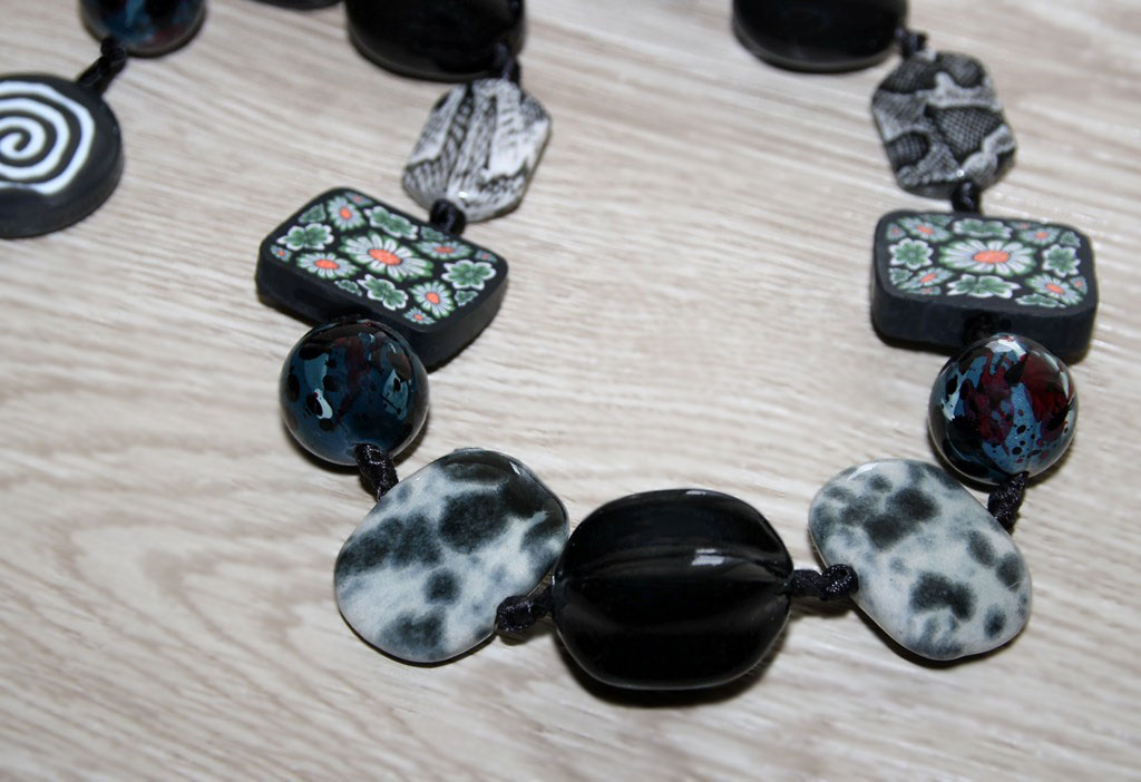 Erineva suuruse ja kujuga glasuuritud savihelmeste ja FIMO polümeersavist lilleliste detailidega kaelakee.