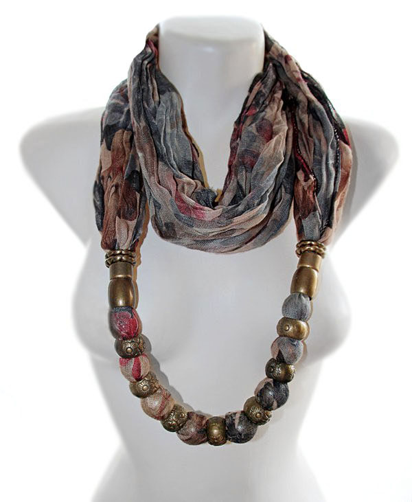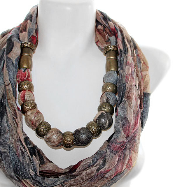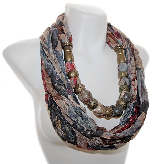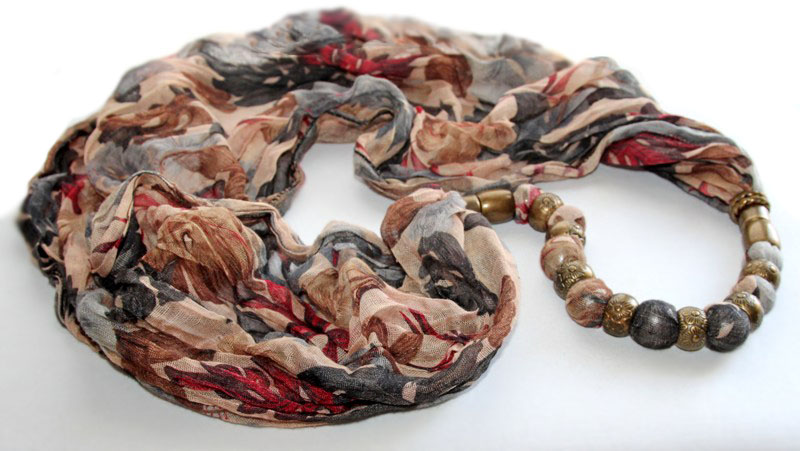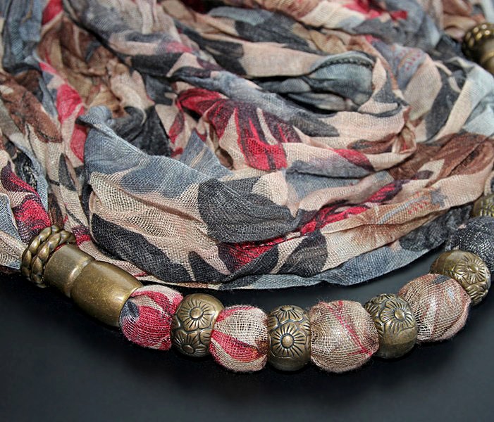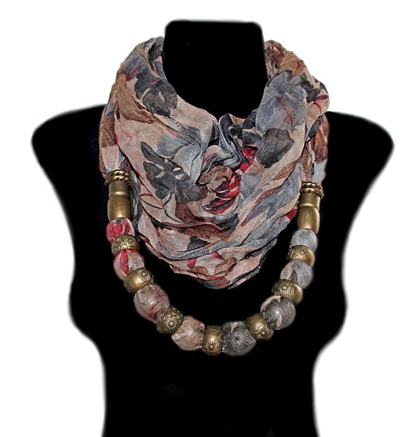 Hallides-beežides-pruunides toonides lillemustrilisest viskooskangast pehme rõngas-sall otstesse kinnitatud pronksivärvi kaunistusdetailide ja salli kangast helmekeega. Salli kangaga kaetud puuhelmeste ja pronksivärvi lillemustriliste sallirõngastega kee pikkus on 35 cm. Marlilaadsest hõredakoelisest materjalist sall on üsna õhuke ning seda saab mitmekihiliselt ümber kaela keerata.