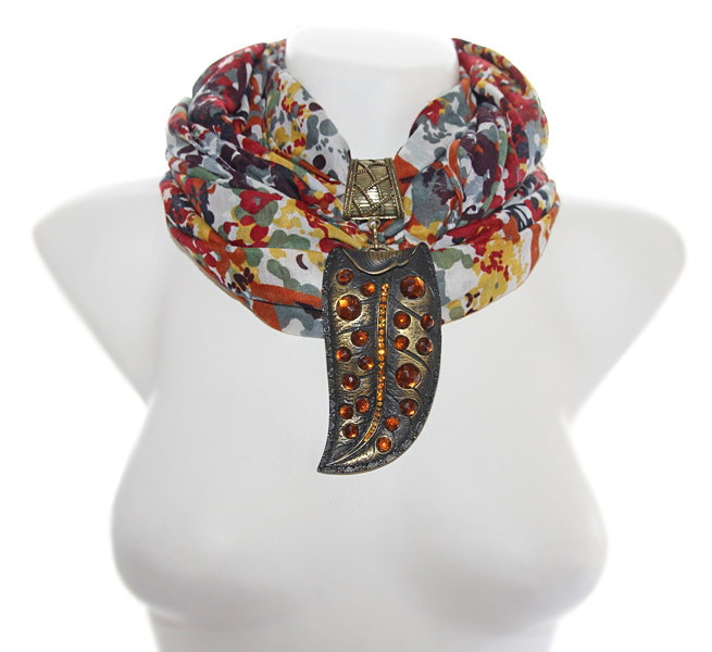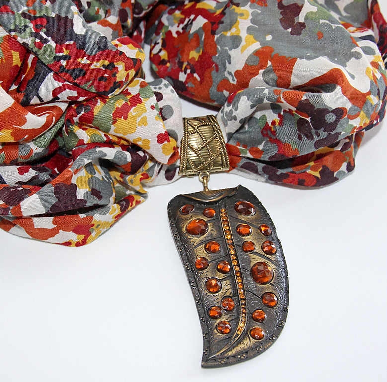 Suur lehekujuline metallripats on kaunistatud väikeste säravate pruunikas-kollaste klaaskristallide ja erineva suurusega ümmarguste akrüülkameedega, ripatsi suurus on 5 cm x 10 cm. NB! Ripats on üsna suur ja “kaalukas”! Salli (täisringi) pikkus on 160 cm ja laius 100 cm.
