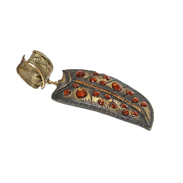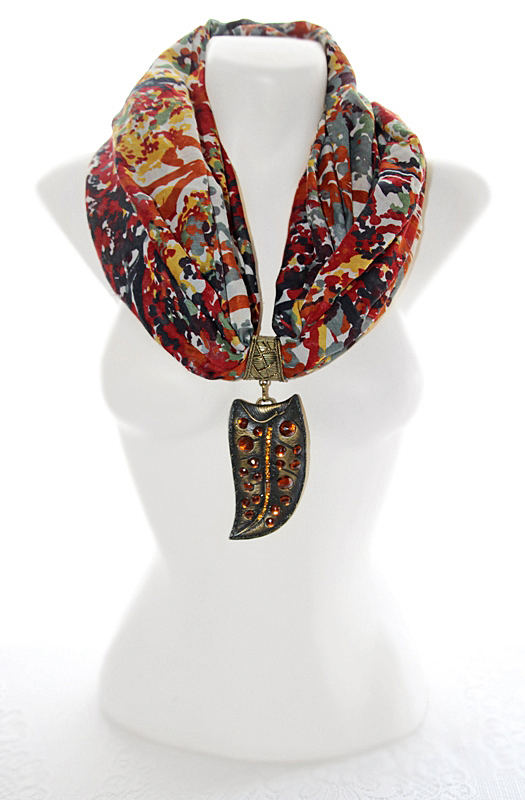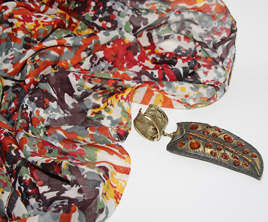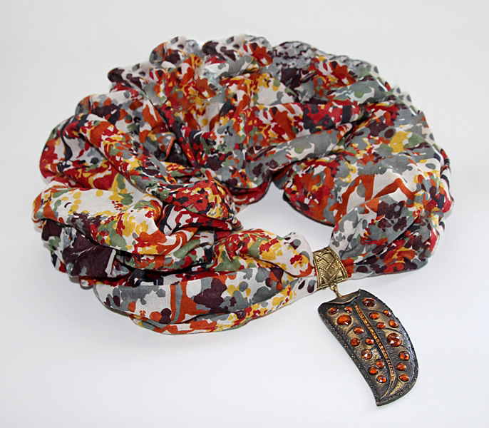 NB! Tegemist on redisainitud tootega, kus nii sall kui ripats on uuskasutuseks korda tehtud. Salli ripatsina on kasutatud katkiläinud vöö pannalt. Pandla tagaküljele on kristallvaiguga kinnitatud tugev riputusaas ning tagakülg on värvitud spetsiaalse metallivärviga üleni pruuniks.