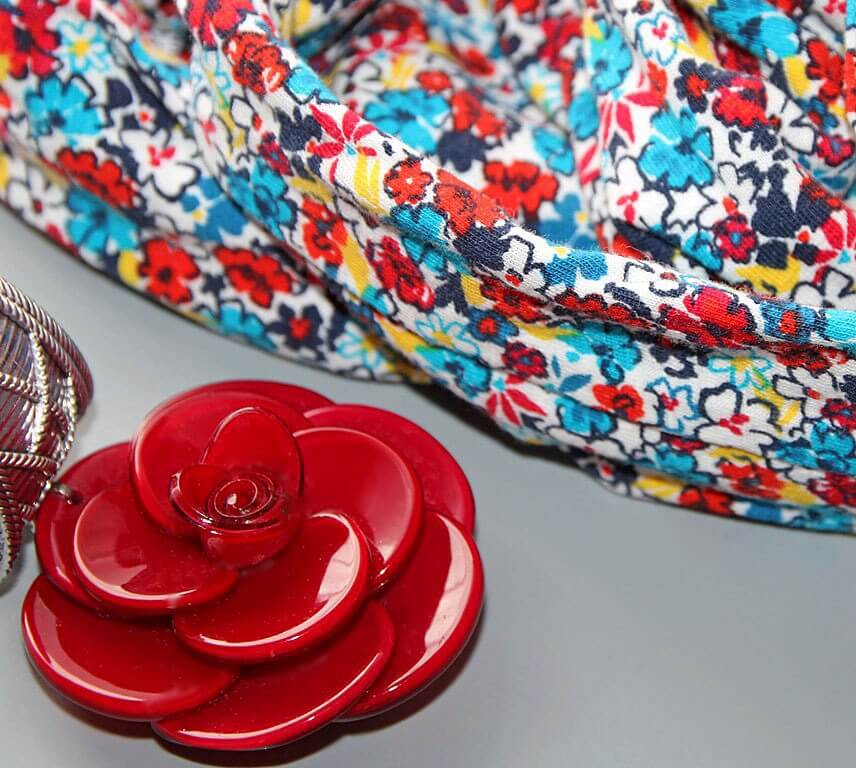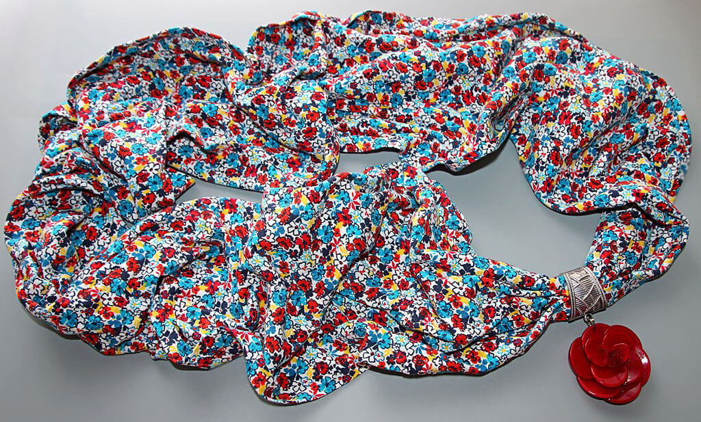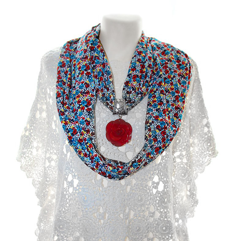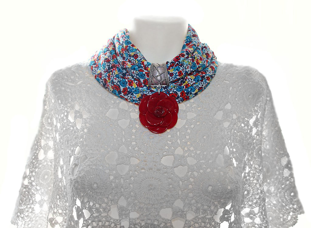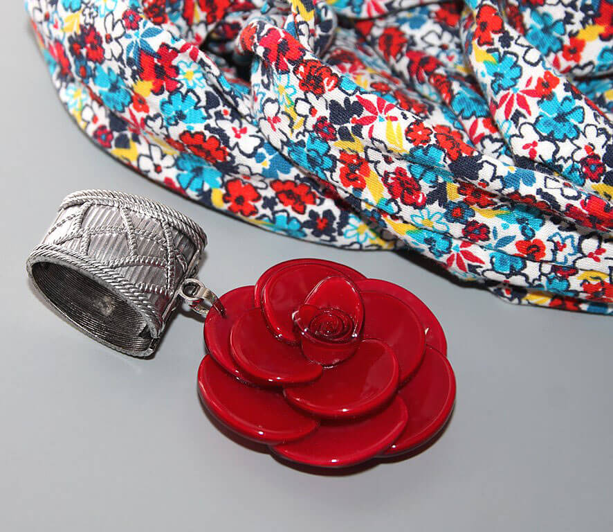 Värvilisest lillekirjust pehmest puuvillasest trikotaažist suuremat sorti rull-sall hõbedavärvi sallihoidja ning suure punase lilleõiemotiivist ripatsiga.