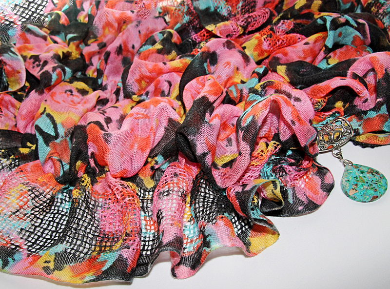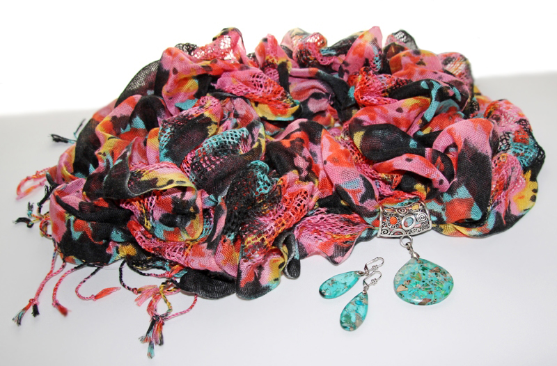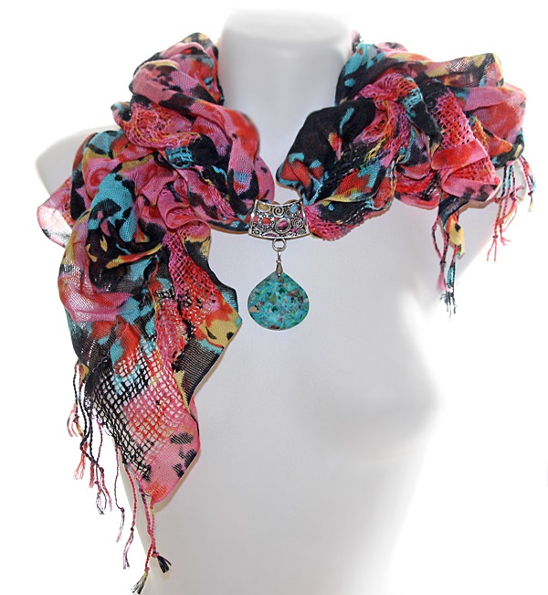 Roosa-türkiisi-musta-kollasekirju pehmest viskooskangast hõredakoeline narmastega sall hõbedavärvi etnomustrilise sallihoidja ning jaspise mosaiik-kivist ripatsiga. Kauni türkiisivärvi jaspise tilgakujulisest kivist ripatsi suurus on 4 cm x 4 cm.