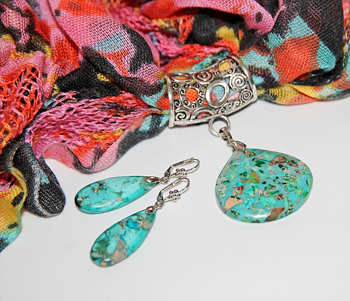 Kirju sall türkiisivärvi jaspise mosaiikkividest ehtekomplektiga