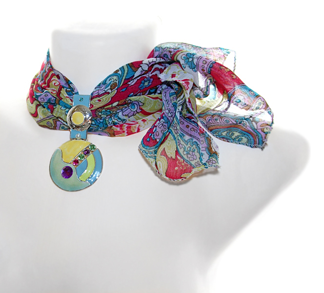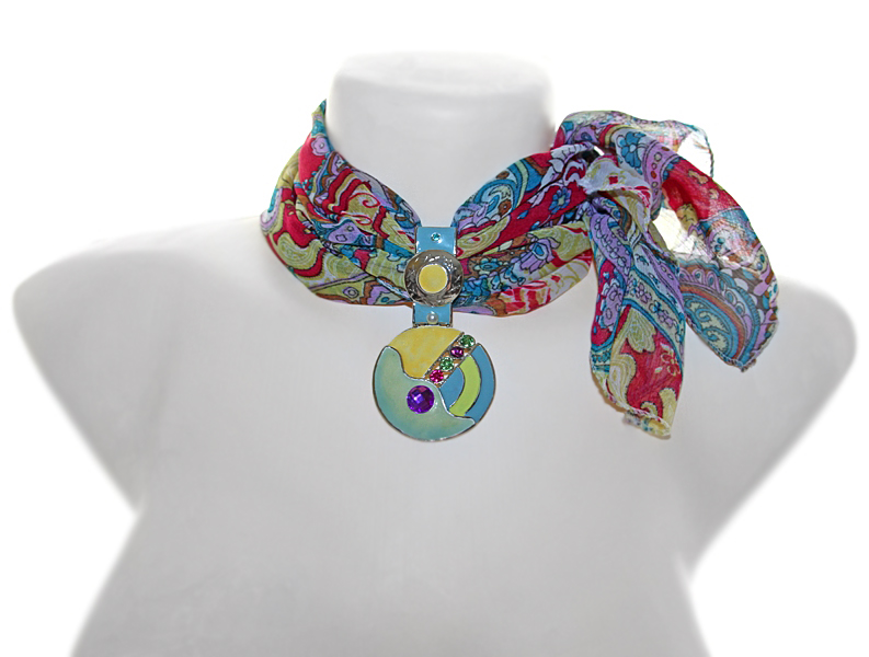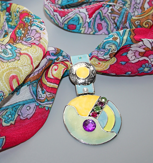 Fuksiaroosa-sinise-kollasekirju polüesterkangast õhuline sall klaaskristallidega kaunistatud värvilise metallripatsiga.