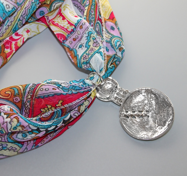Sallikaunistuseks kasutatud ripatsi taga on kaks aasa, millest õhuke sall on läbi tõmmatud.