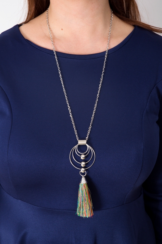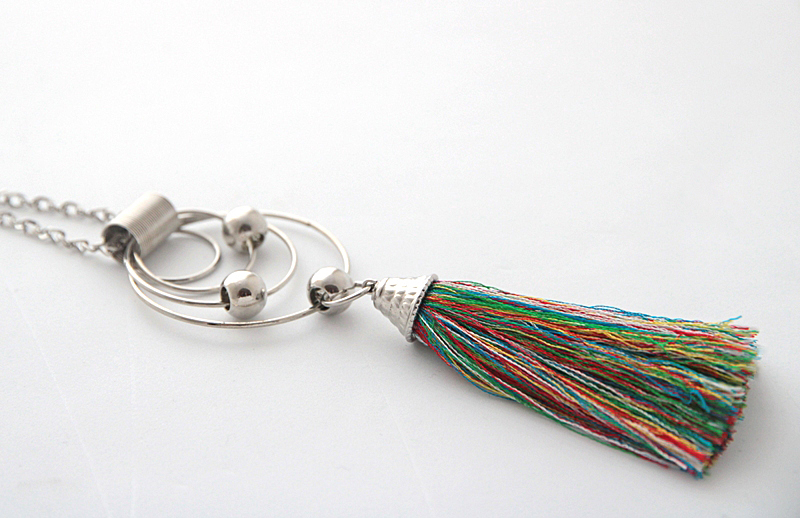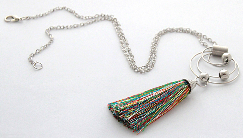 Hõbedavärvi metallketi, rõngaste, metallhelmeste ja kirjutest siidiniitidest tutiga kaelakee. Metallhelmed on rõngastel lahtiselt “liikuvad”, tutiga kaunistusdetail on kinnitatud ühe metallhelme külge. Ripatsi kogupikkus on 14 cm.