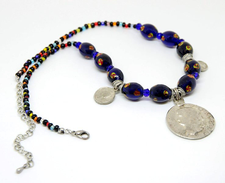 Väikeste värviliste seemnehelmeste, mustade ja tumesiniste klaashelmeste ning hõberahasid meenutavate ripatsitega rahvuslikel ainetel kaelakee. Vanahõbedavärvi suure “metallraha” läbimõõt on 3 cm. Kaelakee pikkus on reguleeritav karabiinhaagi ja kee lõpetusketi abil 45 cm-st kuni 54 cm-ni