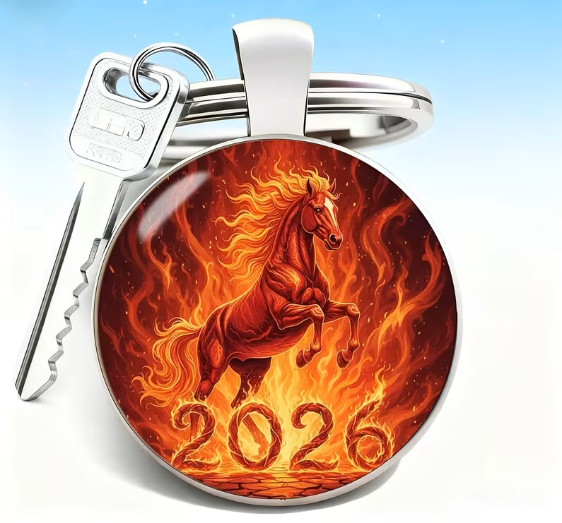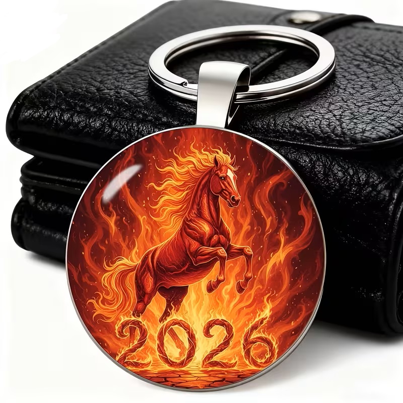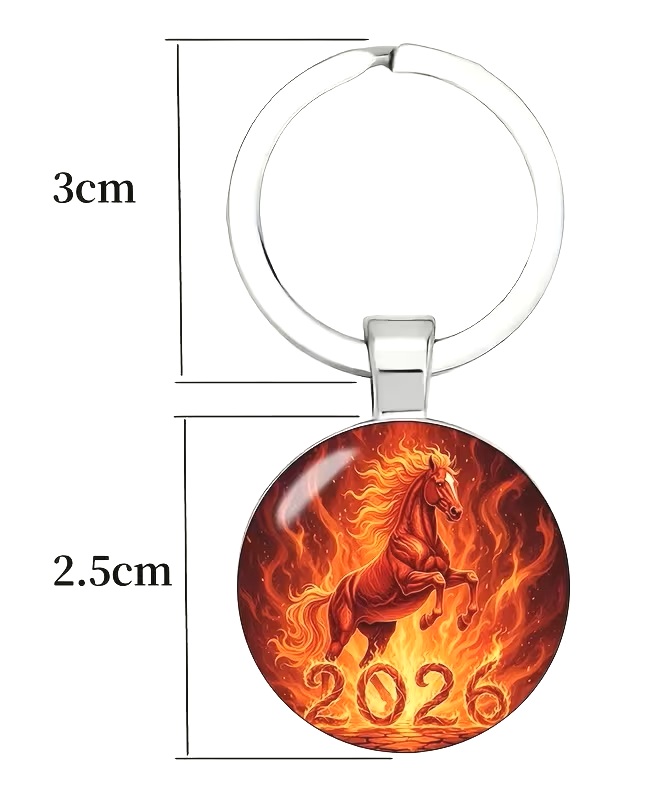Ümmarguse hõbedavärvi metallraami ja stiliseeritud, Hiina kalendri 2026.aastat sümboliseeriva tulihobuse kujutisega klaaskameega väike võtmehoidja.