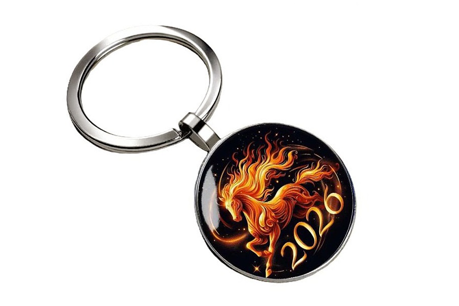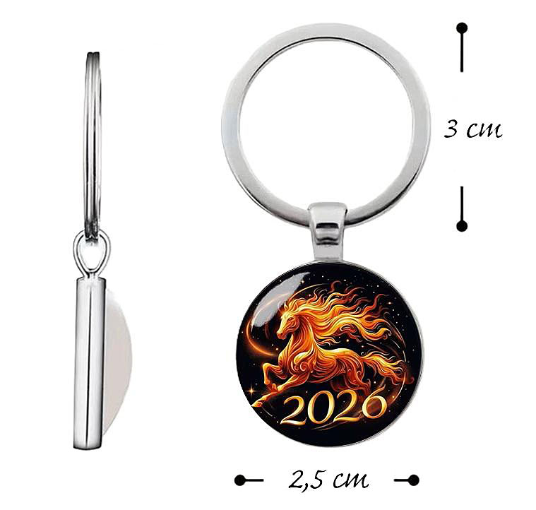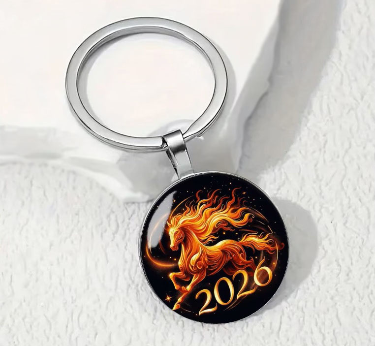 Ümmarguse hõbedavärvi metallraami ja stiliseeritud, Hiina kalendri 2026.aastat sümboliseeriva stiliseeritud tulihobuse kujutisega klaaskameega väike võtmehoidja.