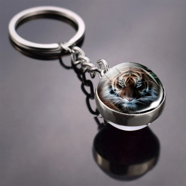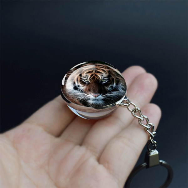 Tiigri pea tumepruunides toonides pildi ja klaaskuuliga ripats-võtmehoidja hõbedavärvi keti ja rõngaga. Klaaskuuli sees olev tiigri peaga pilt on kahepoolne. Efektne ruumiline ripats sobib nii võtmehoidjaks kui ka käekoti kaunistuseks.