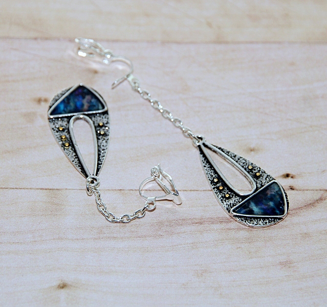 Väikese hõbedavärvi klõpskinnise, keti ja etno stiilis ripatsiga kõrvarõngad. Hõbedavärvi metallripatsil on tillukesed kullavärvi täpikesed ja kristallvaiguga kaetud sinistes värvitoonides kaunistus. Kõrvarõngaste pikkus on 6 cm.