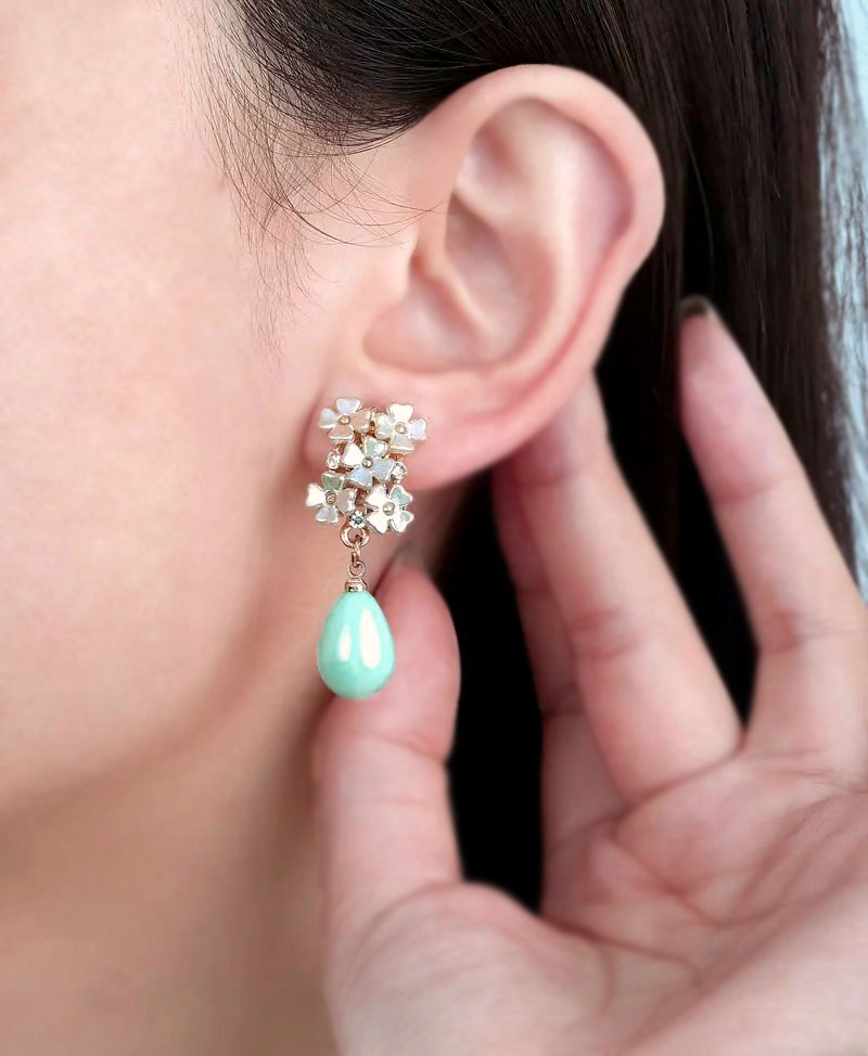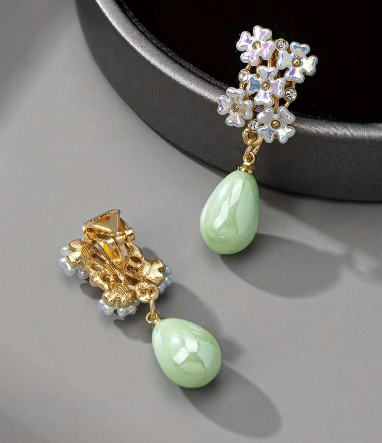 AB-läikelise* lillekobara ja kaunilt helkleva helerohelise tilgakujulise akrüülpärlist ripatsiga kõrvarõngad väikese kullavärvi klõpsuga.
