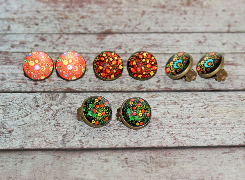 Pronksivärvi alusraami ja rahvusliku tikandi motiividel klaaskameega kõrvarõngad klõpsuga.