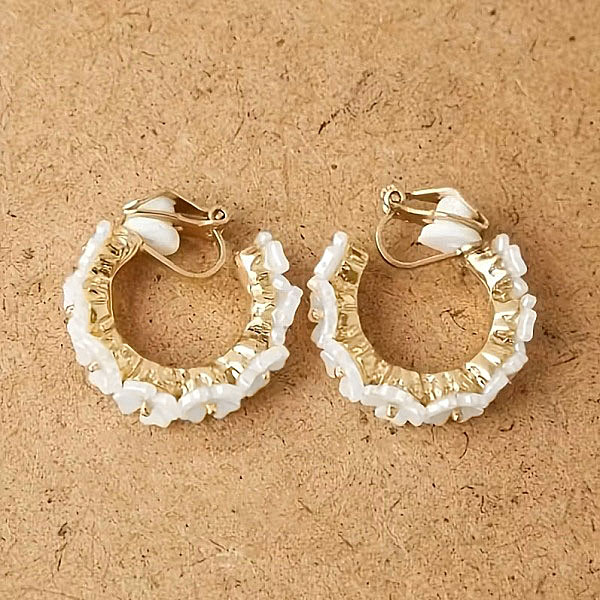 Väikeste valgete pärlmutterläikeliste lillekestega rõngad kullavärvi klõpskinnisega.