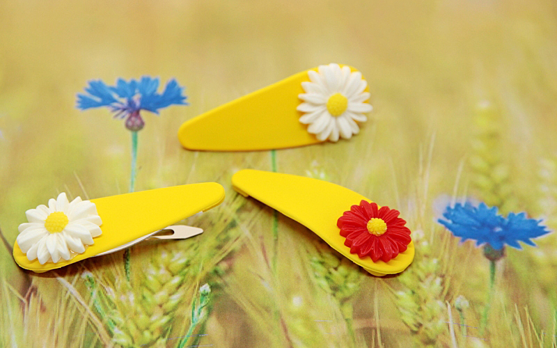 Hõbedavärvi kinnise ja kergest plastikust erksat kollast värvi juukseklamber punase lillega. Läbipaistvast plastikust klambri pealne on kaetud mati kollase silikoonvärviga. Kunstvaigust lille suurus on 2,3 cm, juukseklambri pikkus on 6,5 cm