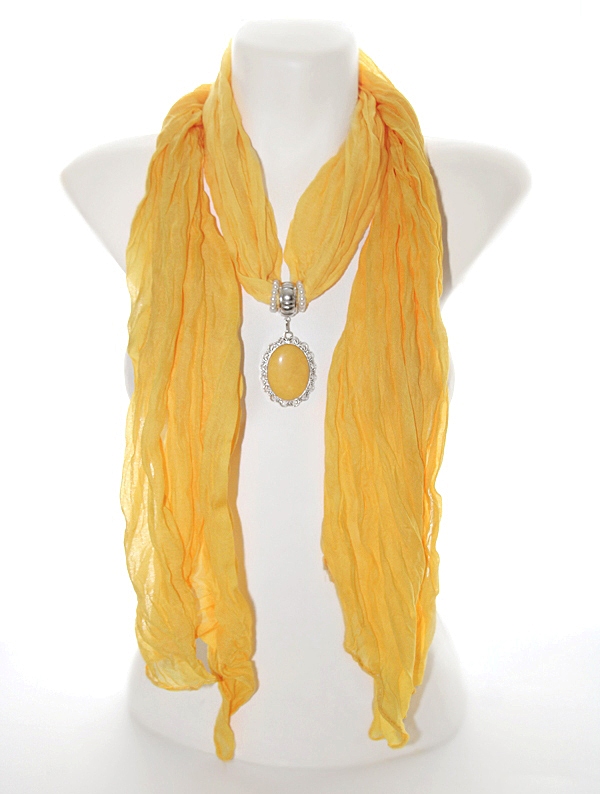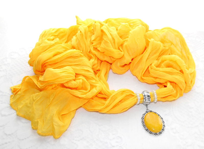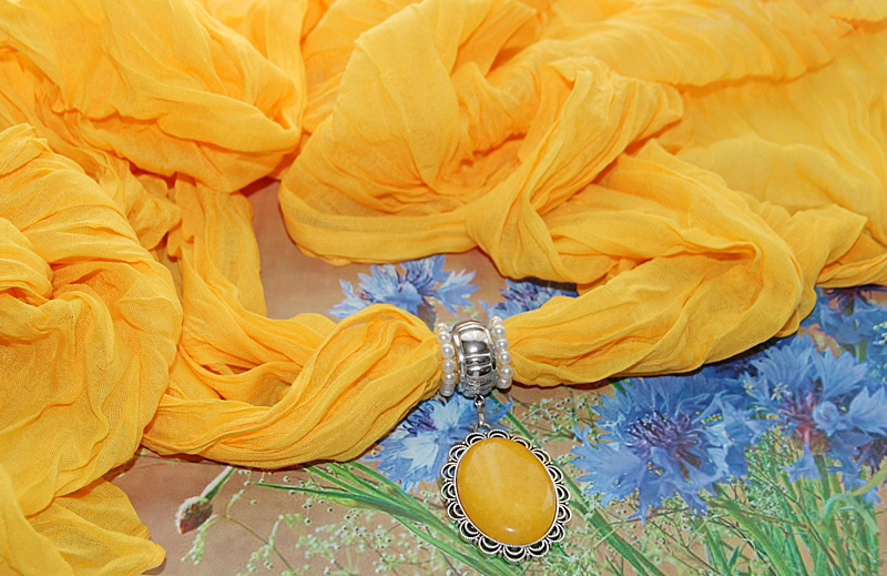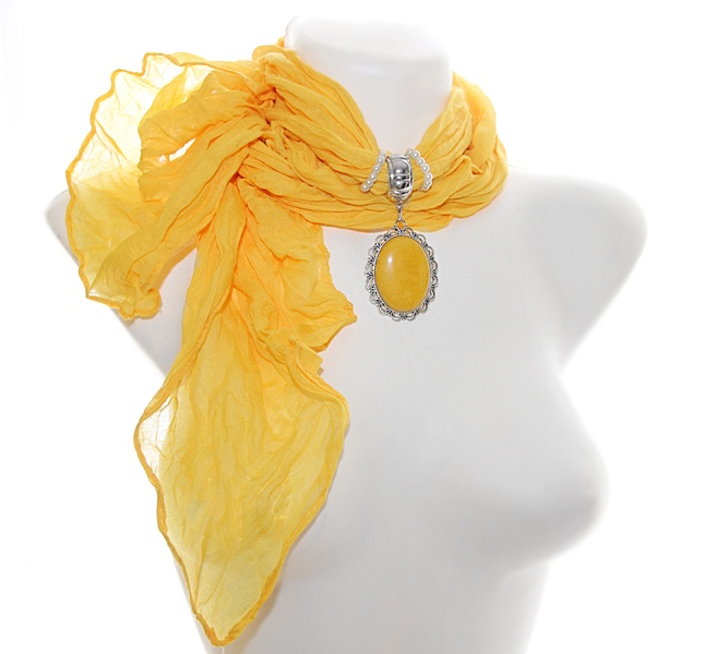 Kuldkollane viskooskangast pikk sall hõbedavärvi sallirõnga, kahe väikestest pärlitest kaunistusrõnga ja suure kollase sünteetilisest mesilasvahast kameeripatsiga.