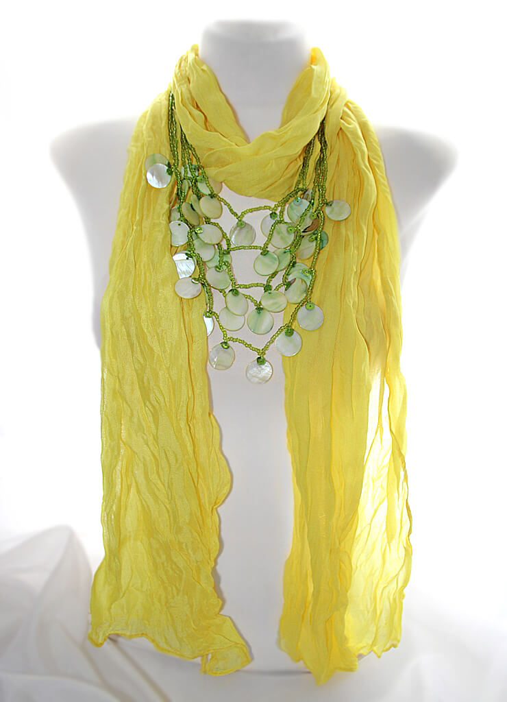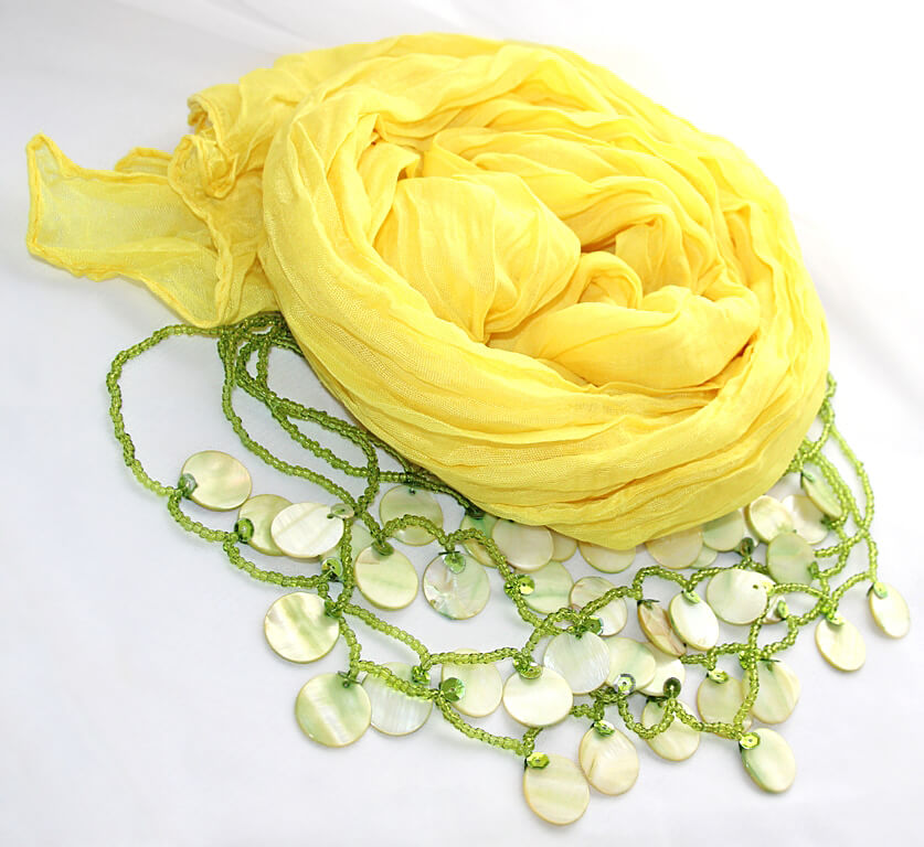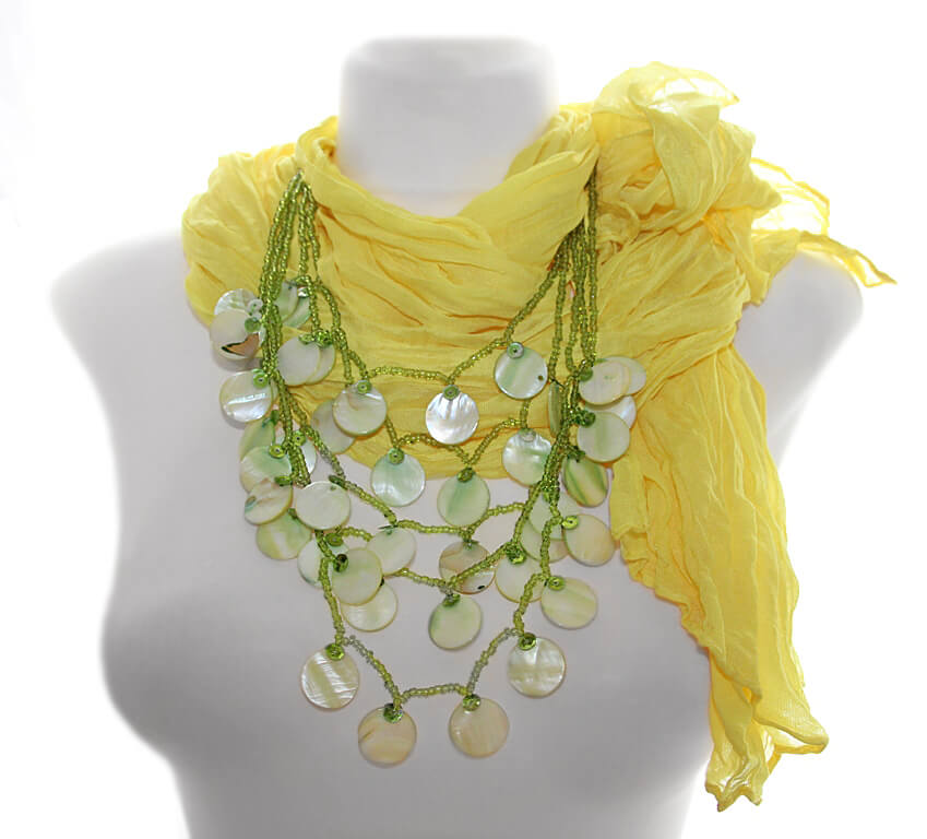 Sidrunikollasest erksavärvilisest viskooskangast pikk sall komplektis mitmekihilise merekarpidest (shell) ripatsite ja rohelistest klaashelmestest kaelaehtega.