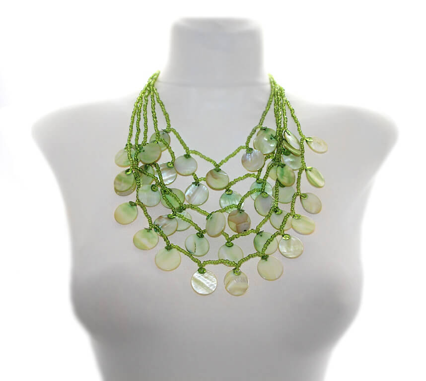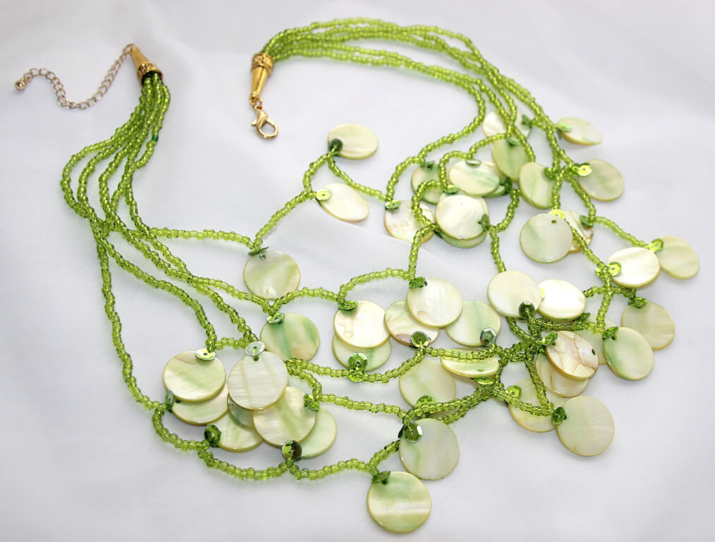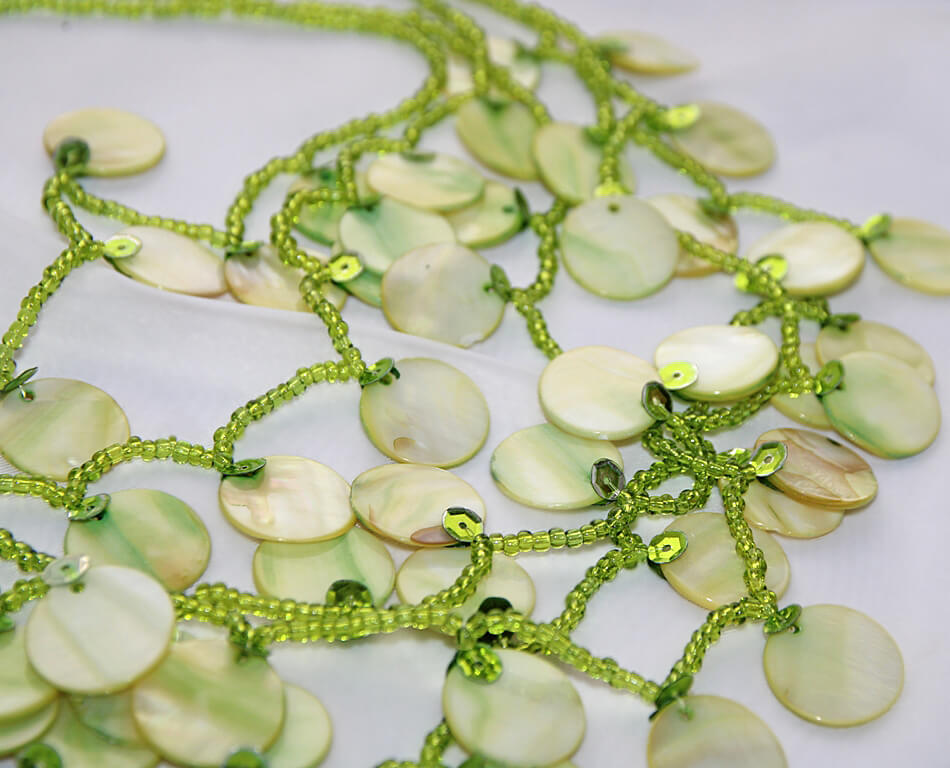 Roheliseks toonitud merekarbiripatsid on kaunistatud säravate erkroheliste litritega ja kinnitatud rohelistest klaashelmestest kee-rea vahele. Ümmargused merekarbi (shell) ripatsid on umbes 10-sendise mündi mõõtu. Keeread on omavahel kokku sõlmitud ning kaetud koonusja antiik-kuldset värvi helmekapsliga.