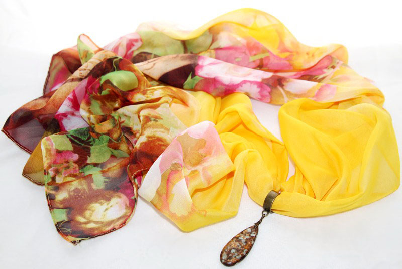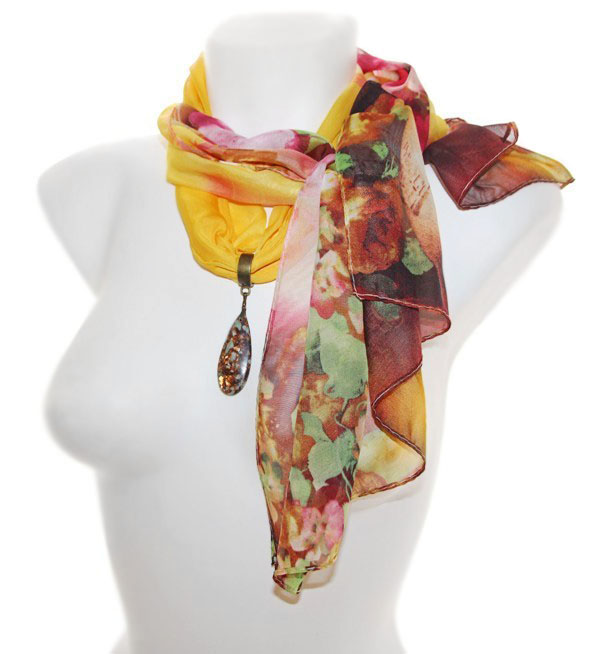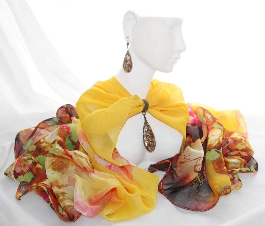 Pruunides toonides lillemustriliste otstega erksat värvi kollane sall pronksivärvi väikese sallirõnga ja püriidi-jaspise segu mosaiik-kivist ripatsiga. Kahe loodusliku kivi väega ripatsi suurus on 2 cm x 5 cm. Pehmest ja hästilangevast polüesterkangast salli mõõdud on 50 cm x 150 cm.