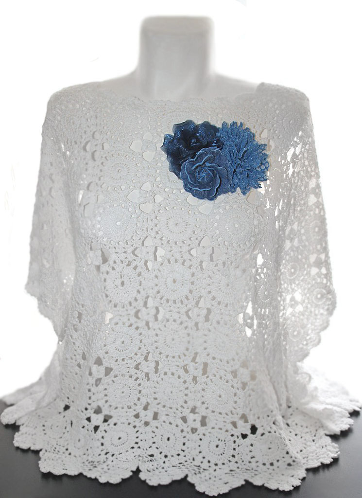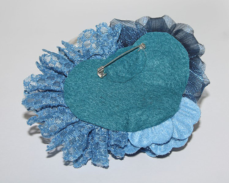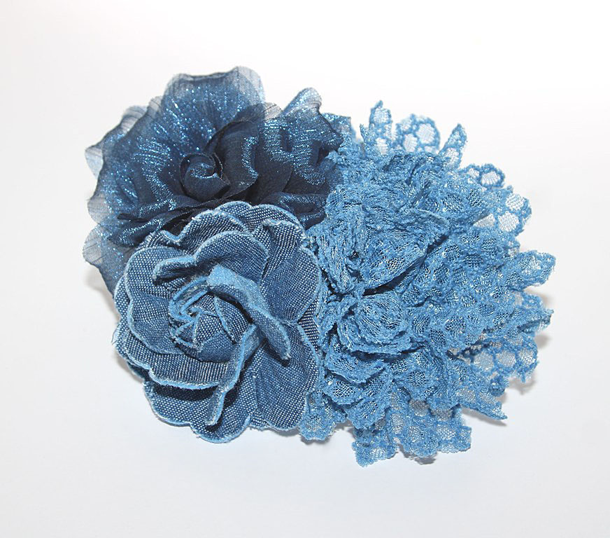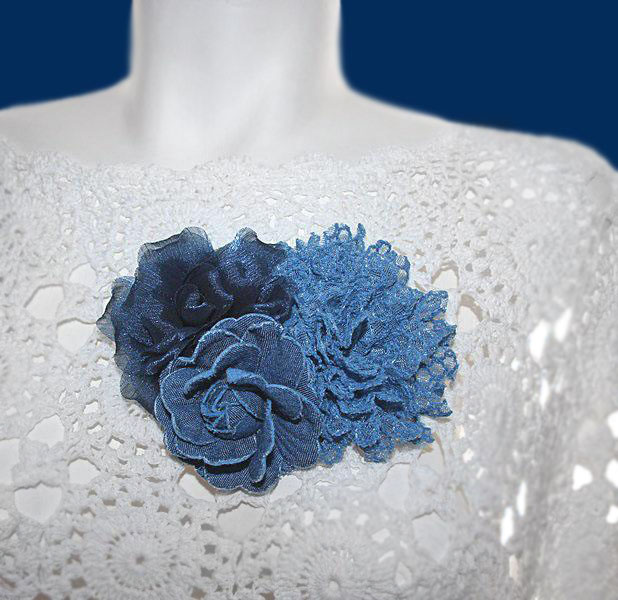 Kolmest erineva tekstuuri ja värvitooniga sinisest kangast lilleõiemotiividega suuremat sorti efektne pross.
