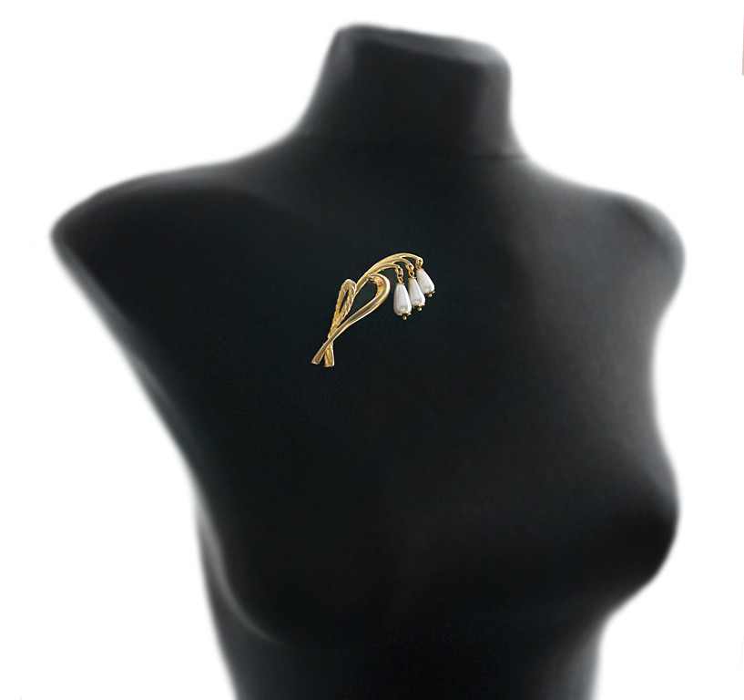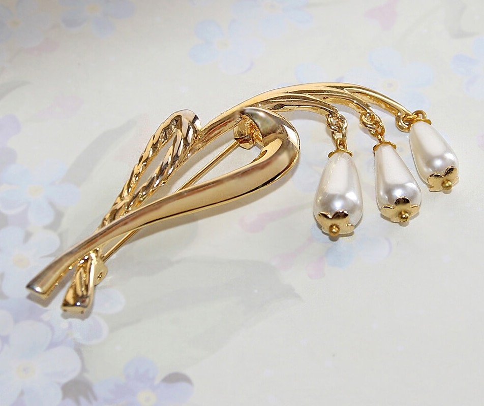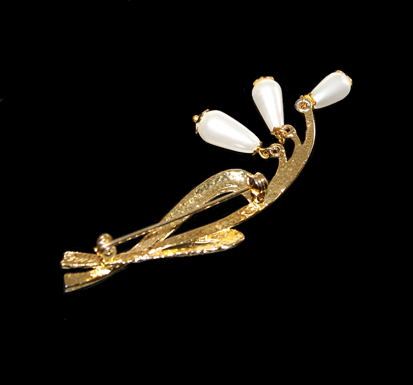 Kolme tilgakujulise (pisut kreemika tooniga) valgete pärlripatsiga piibelehemotiiviga kullavärvi pross.