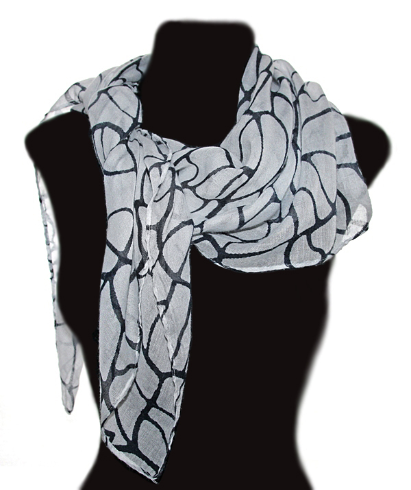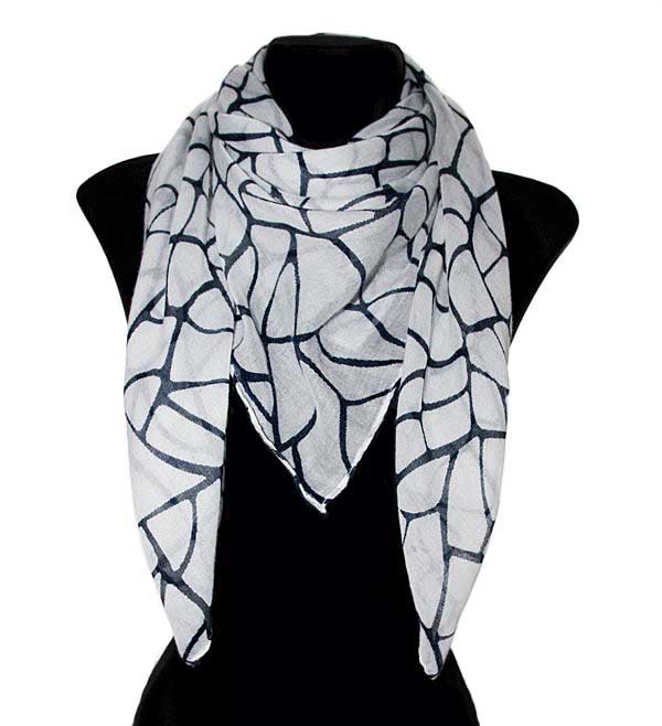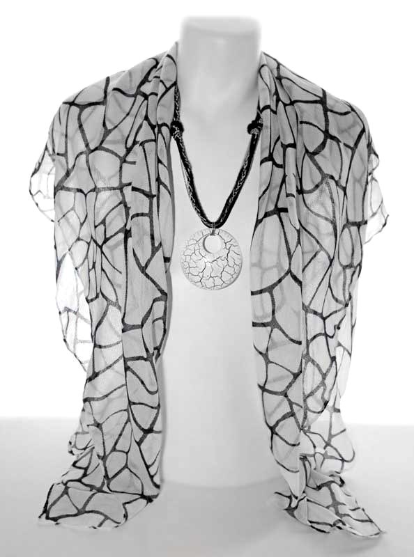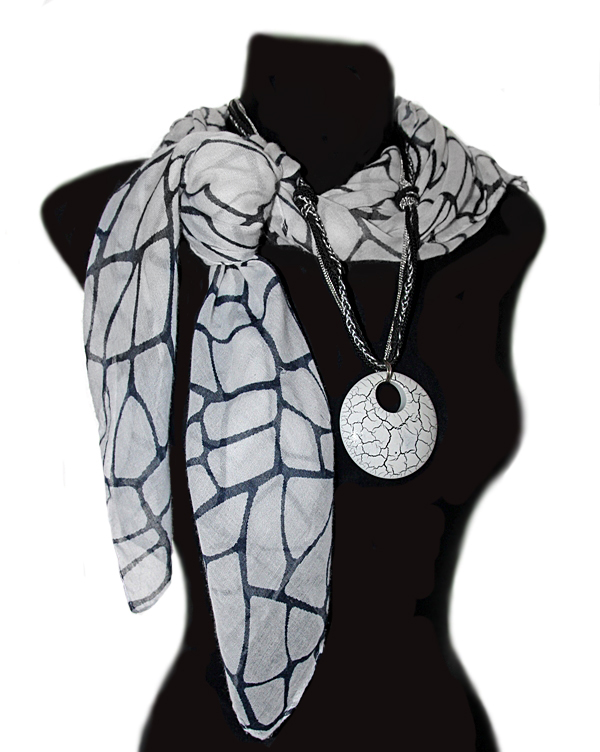 Pehmest ja õhukesest puuvilla-viskoosisegu valge-mustakirjust kangast neljakandiline suuremat sorti kaelarätik komplektis suure ümmarguse kraklee-tehnikas kaunistatud puidust ripatsiga kaelakeega.
