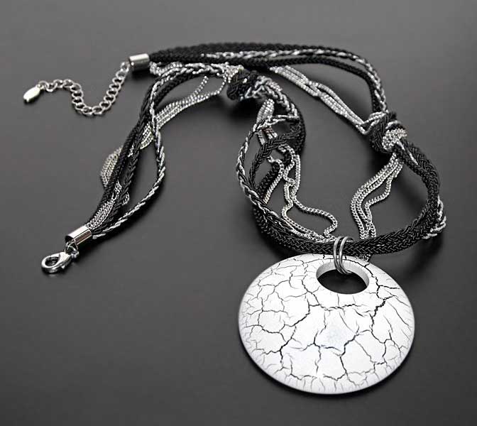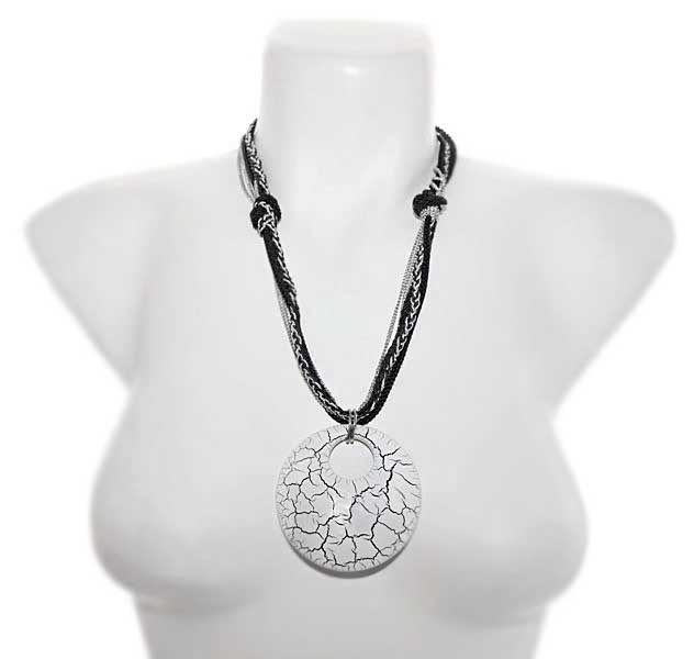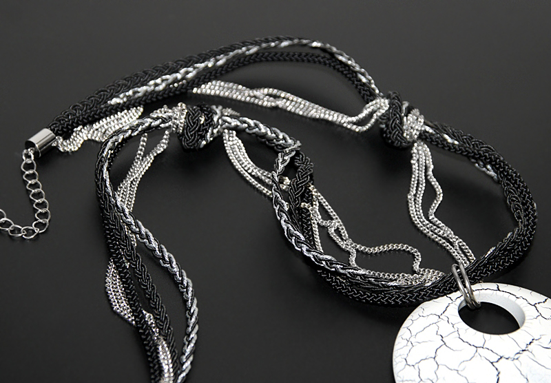Mitmekihilisest mustadest polüesterniidist punutud paeltest ja hõbedavärvi kettidest kaelakee pikkus on reguleeritav 55 cm-st 60 cm-ni. Valge-mustakirju ümmarguse kaunistusdetaili diameeter on 6,5 cm.