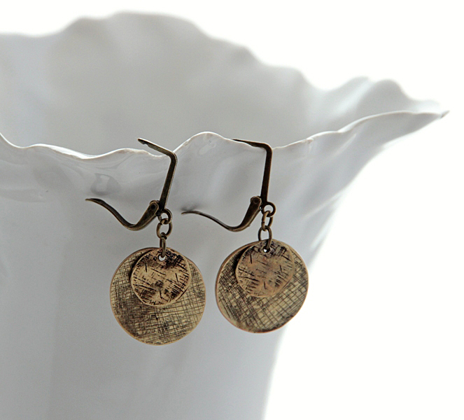Antiik-kuldset värvi kahe metallmünti meenutava ümmarguse ripatsiga kõrvarõngad. Kõrvarõngaste pikkus koos inglise lukuga on on 4 cm