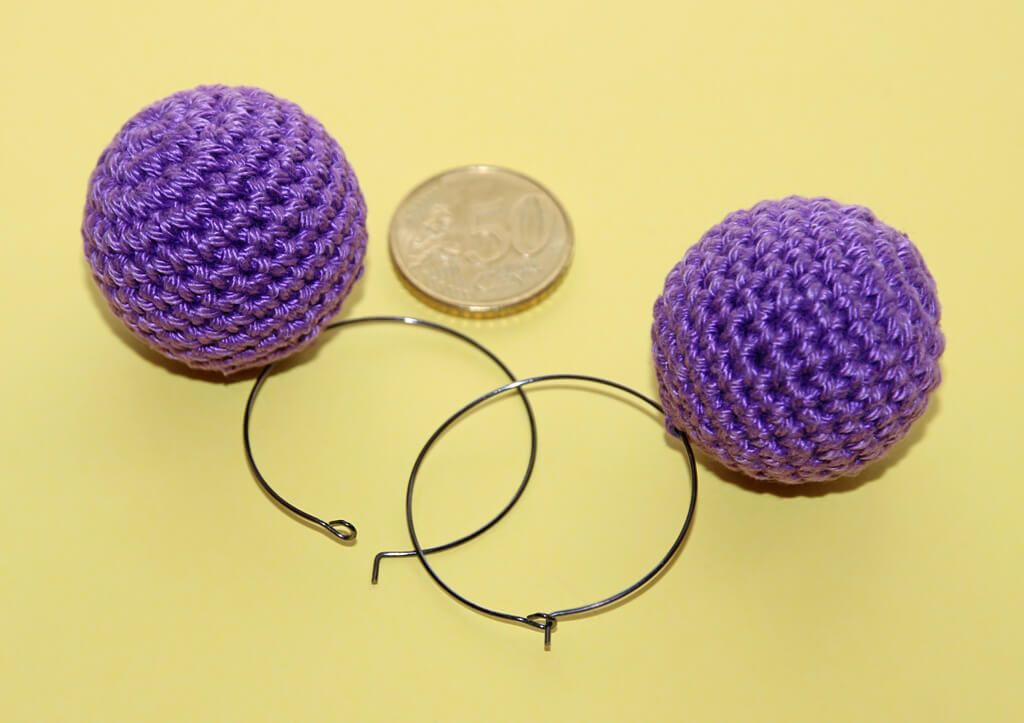 Suurte lillade heegeldatud pallide ja hematiidivärvi peenikeste metallrõngastega kõrvarõngad.