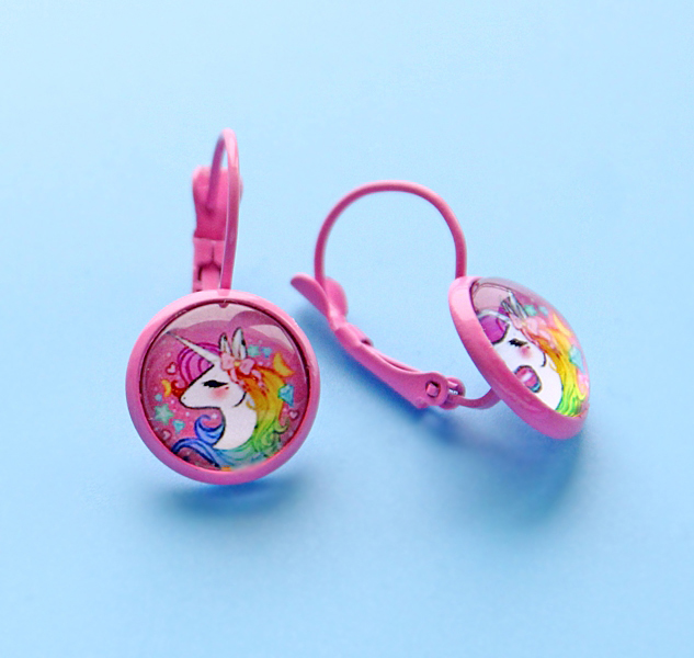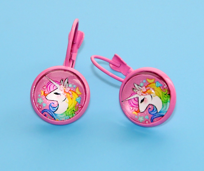 Ükssarviku (Unicorn) motiiviga klaaskamee ja erkroosa metall-alusega kõrvarõngad inglise lukuga.