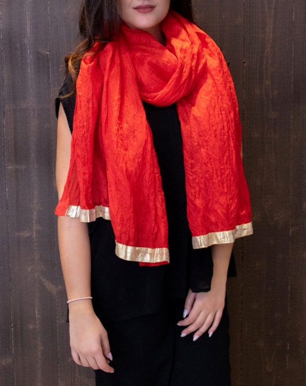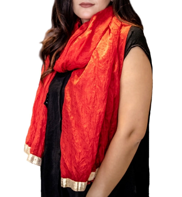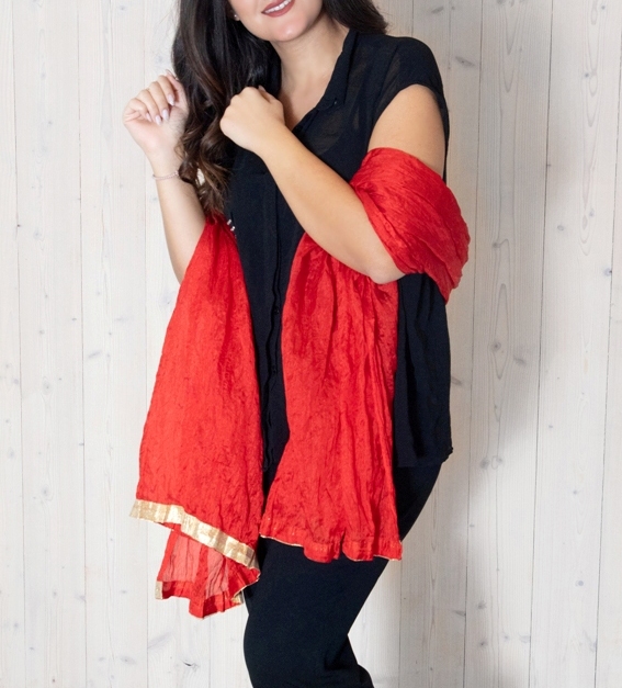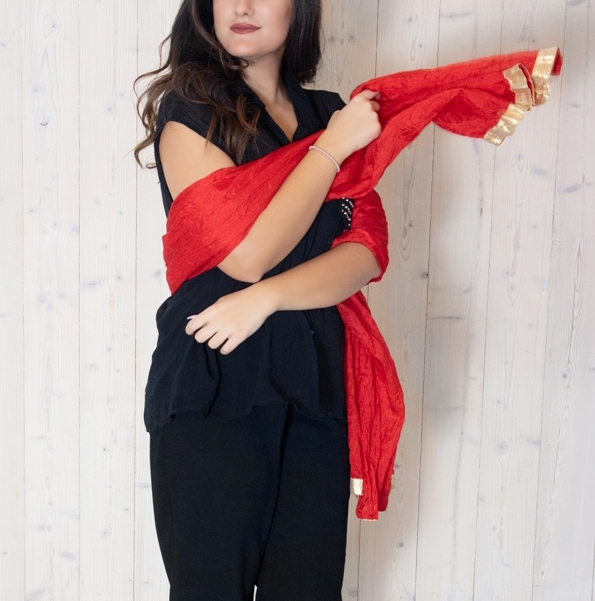 Erksat punast värvi kergelt läikiva ja siidise pinnaga polüesterkangast suur ja kohev sall kullavärvi kaunistuspaelaga. Et sall on üsna lai, siis saab seda pidulike riietega kanda ka efektse õlasallina.