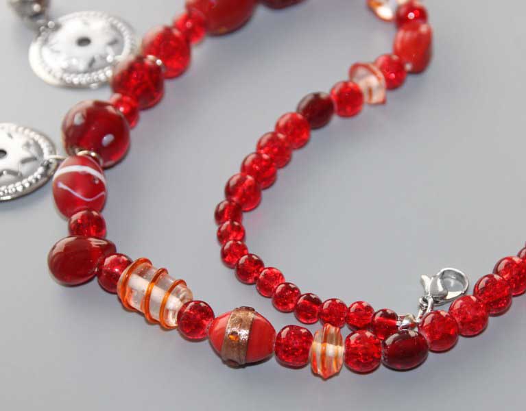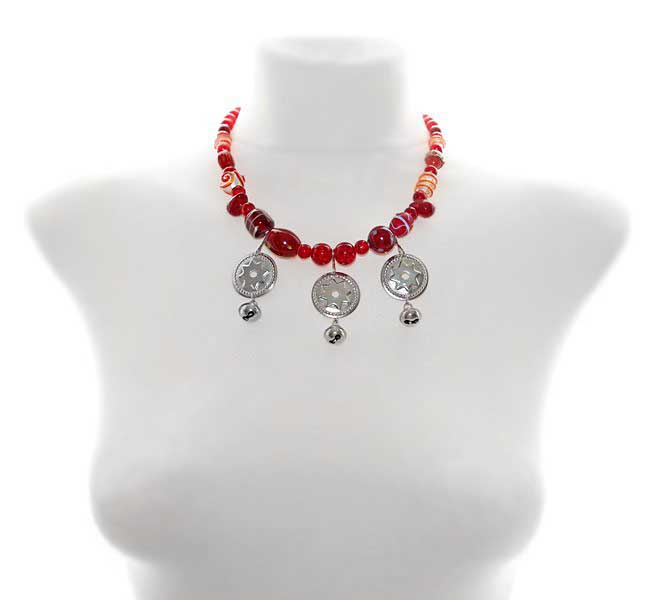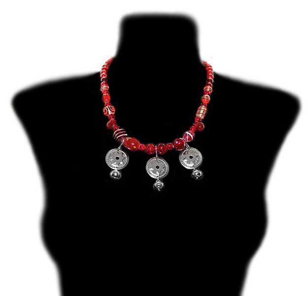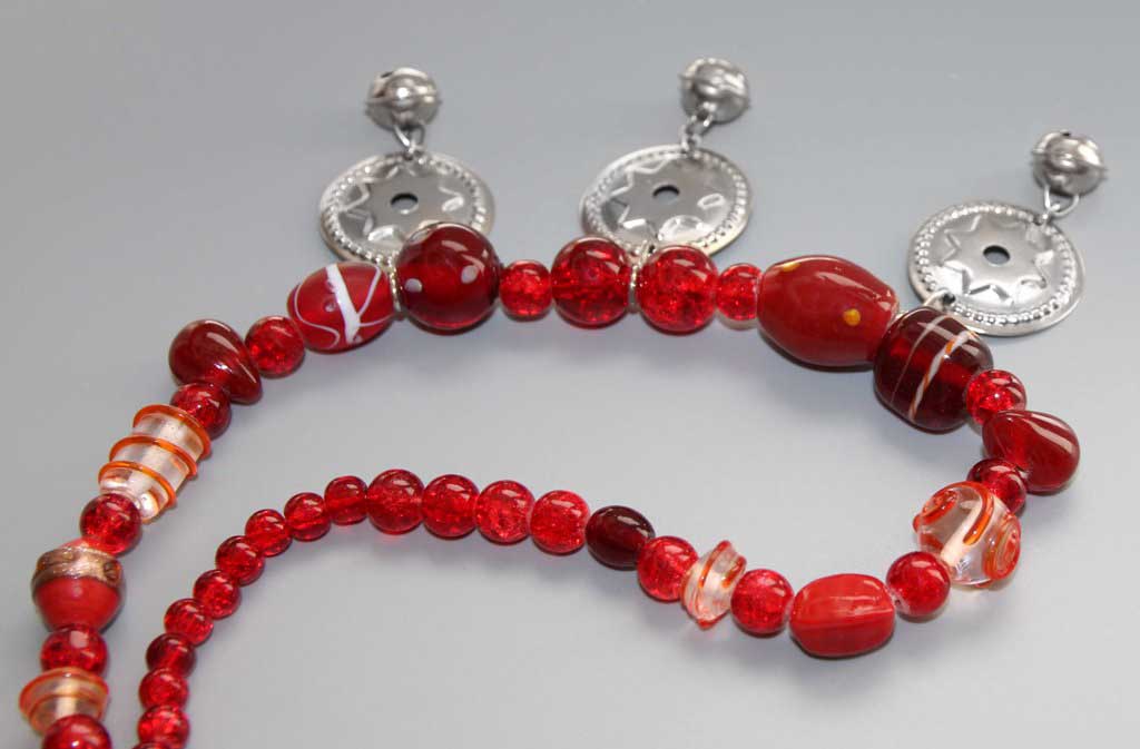 Erinevate punaste klaashelmeste, kuljuste ning kodar-rahasid meenutavate metallripatsitega rahvuslikus stiilis kaelakee.