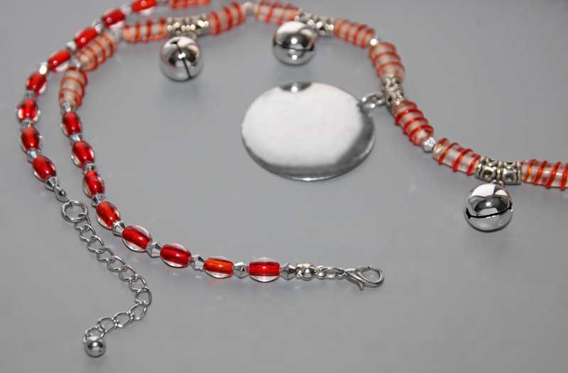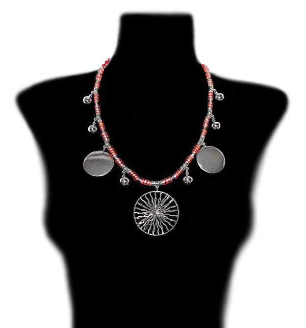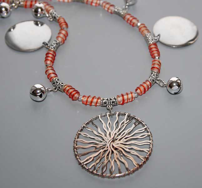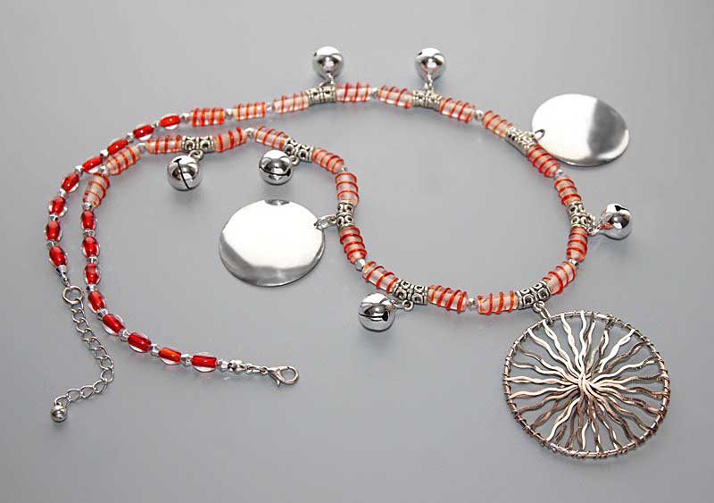 Punasekirjute klaasist “keeruhelmeste”, kuljuste, suurte hõbedaste “rahade” ning reljeefse traadipõimingus “päikeserattaga” rahvuslikus stiilis kaelakee.
