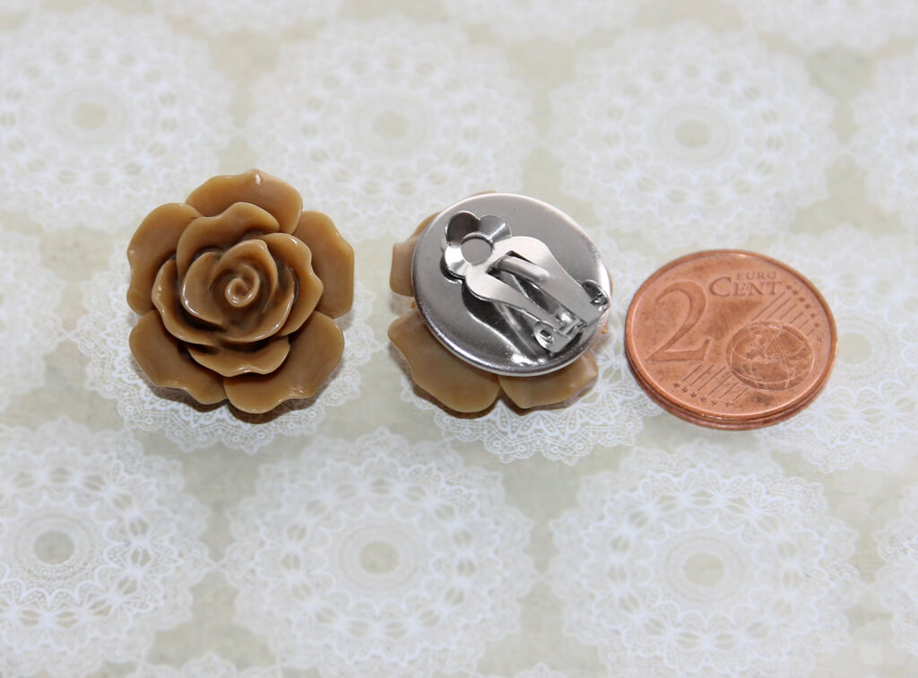 Suuremat sorti pruuni kunstvaigust roosi ja hõbedavärvi metall-alusega kõrvarõngad klõpsuga.